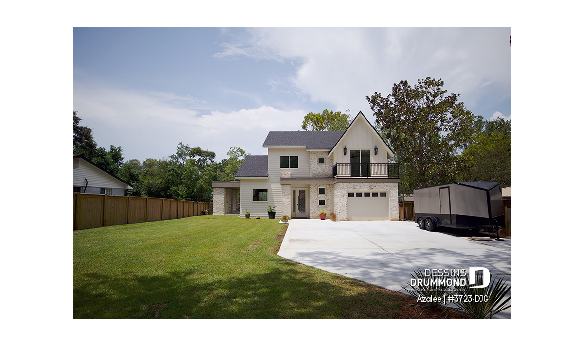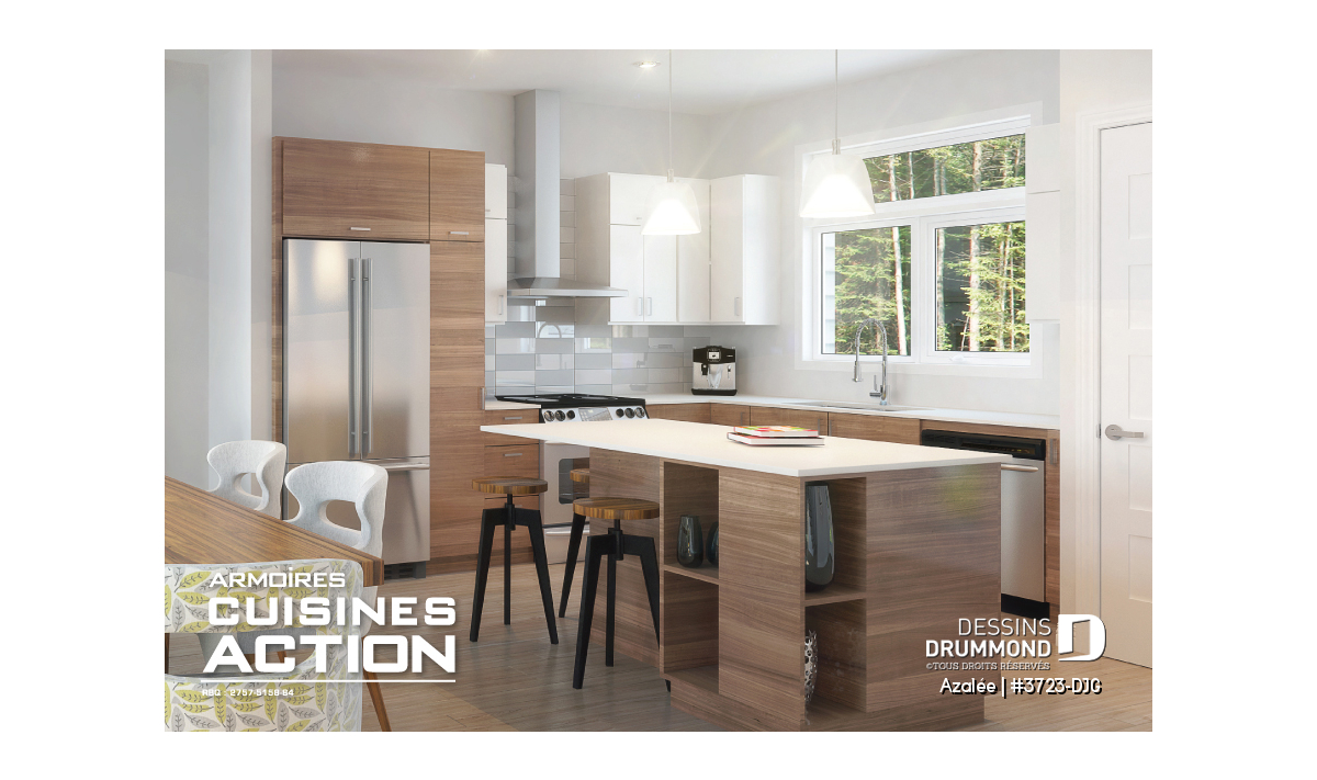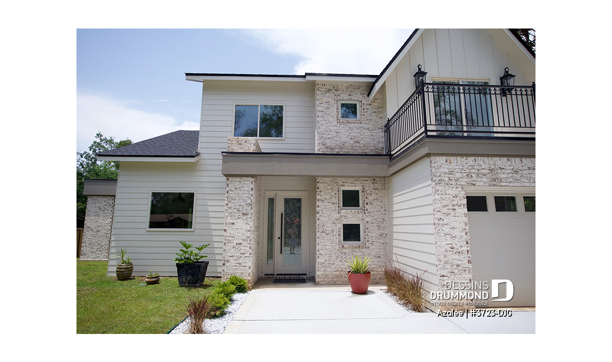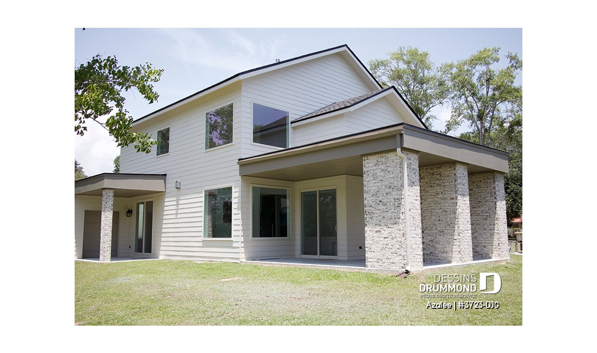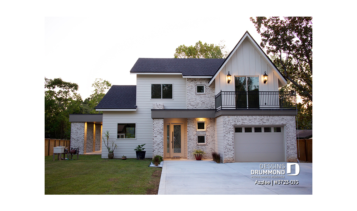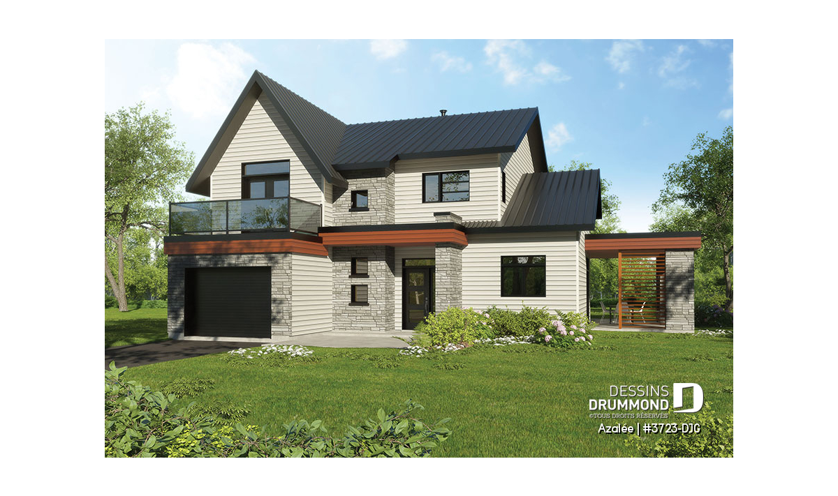 Avec ses touches de pierres naturelles et de bois, l’Azalée propose une architecture chaleureuse et actuelle, parfaitement adaptée aux familles d’aujourd’hui. Pensée pour tirer pleinement profit d’une orientation sud-ouest, la maison maximise les apports solaires naturels. Le plan peut d’ailleurs être inversé ou ajusté selon l’orientation de votre terrain. La pierre du foyer, stratégiquement positionnée, agit comme accumulateur de chaleur passive, tandis que les larges corniches de toit bloquent le soleil d’été tout en laissant entrer la chaleur hivernale. Les pentes de toit de 6/12, idéales pour l’installation de panneaux solaires, et la généreuse surface de toiture permettent même d’envisager l’alimentation du chauffe-eau et du système de chauffage.