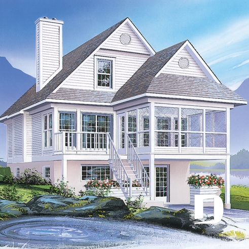 À l’intérieur, en entrant par l’avant de la maison, on est agréablement surpris par un rangement tout à fait adéquat à ce genre d’habitation et par la présence d’une chambre et d’une salle de bain complète au rez-de-chaussée. Ensuite, on constate l’aménagement d’un secteur activités entièrement ouvert et caractérisé par une cuisine en « L » avec îlot-lunch central, une salle à manger abondamment fenêtrée et donnant dans la terrasse avec moustiquaire et une salle de séjour tout autant fenêtrée et agrémentée d’un foyer en coin et d’un accès à la galerie extérieure dotée, pour sa part, d’un escalier permettant d’accéder au terrain.