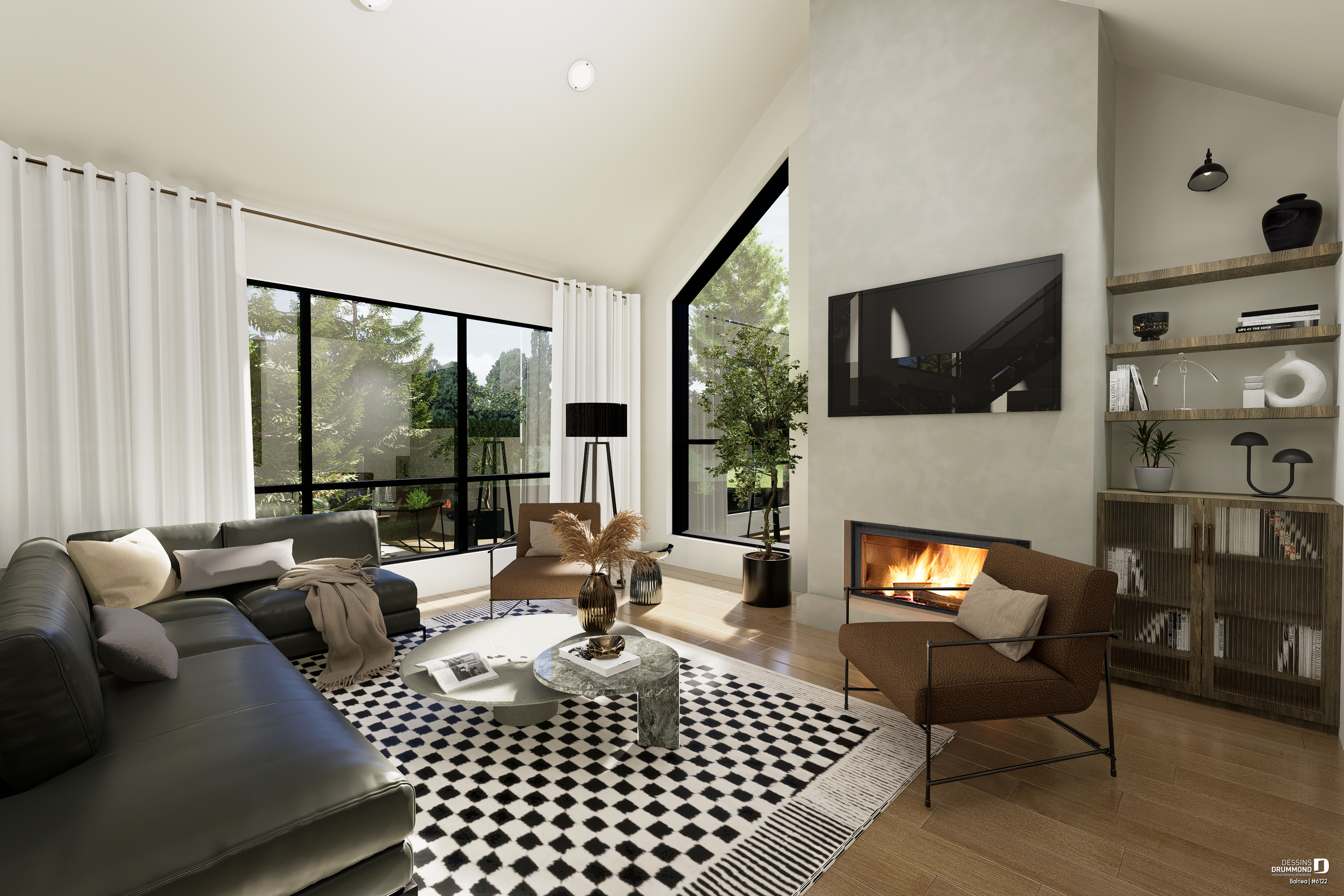 La grande salle familiale est mis en valeur par un plafond cathédrale de 16' et une atmosphère ouverte qui se prolonge dans la salle à manger qui elle aussi propose un plafond cathédral de 18' de hauteur. Au centre du salon, en façade de la maison, trône un superbe foyer, visible depuis la salle à manger et le salon. Le foyer à bois STÛV s21 proposé devient la pièce maîtresse de l’aire de vie : son design élégant et sa performance apportent chaleur, style et ambiance scandinave, transformant chaque moment en expérience cocooning et raffinée.