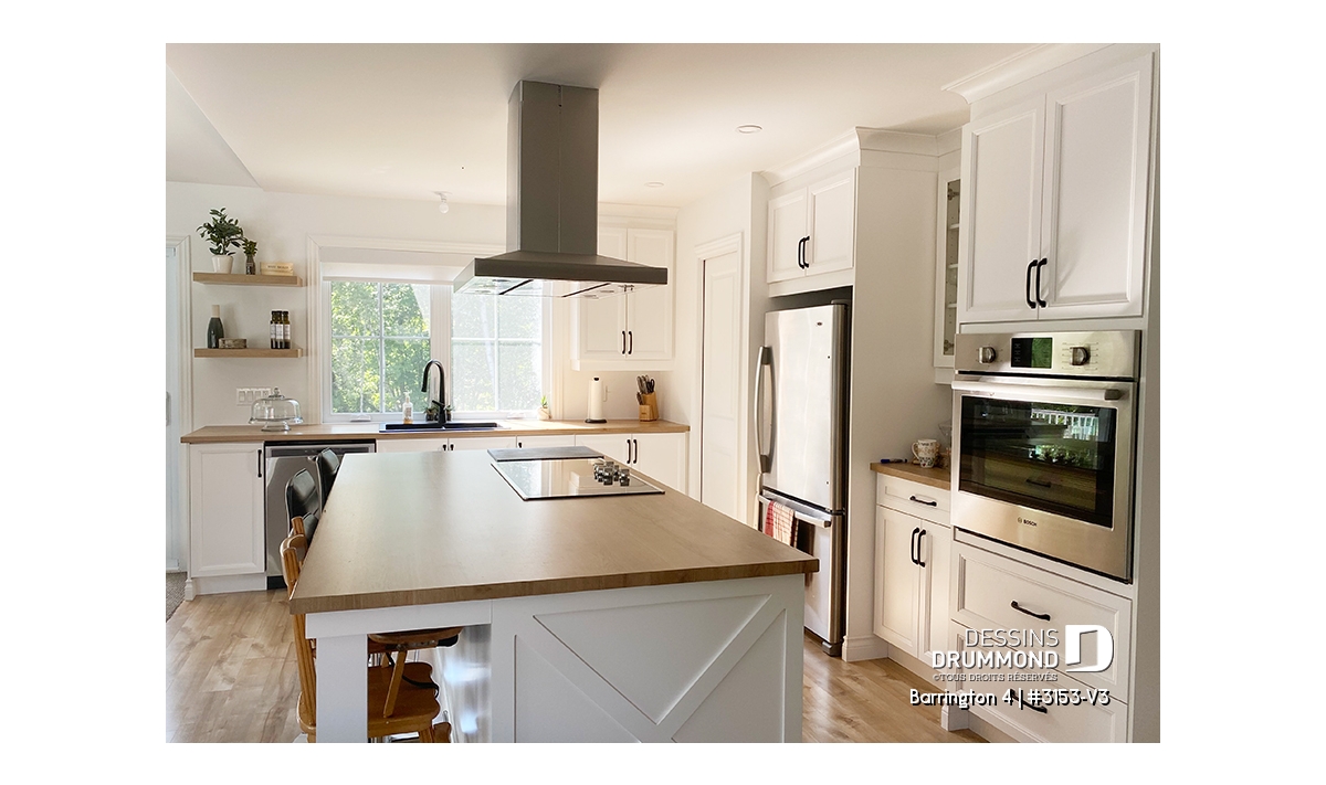 Grande cuisine avec garde-manger et espace cellier sous l'îlot.