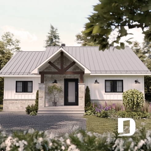 Plan de maison **éco-responsable de style farmhouse avec proposition d'aménagement de sous-sol (optionnel $).