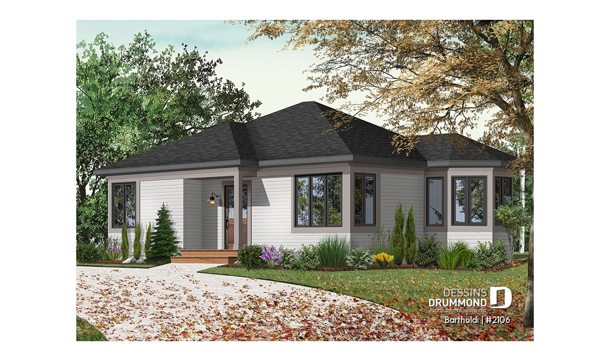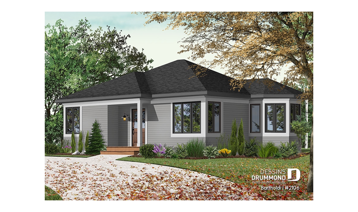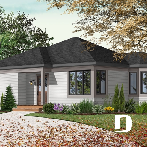 Plan de plain-pied petit format à 2 chambres, avec superbe fenestration