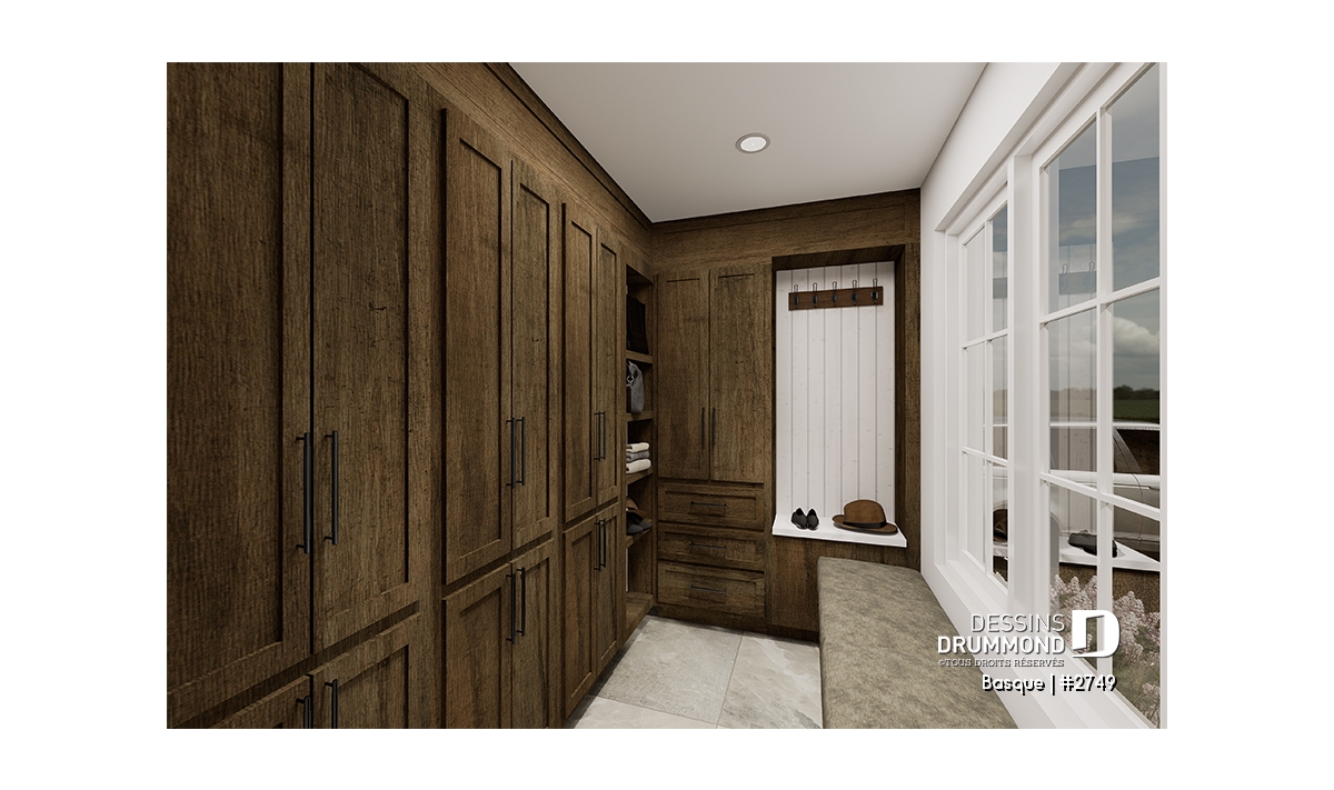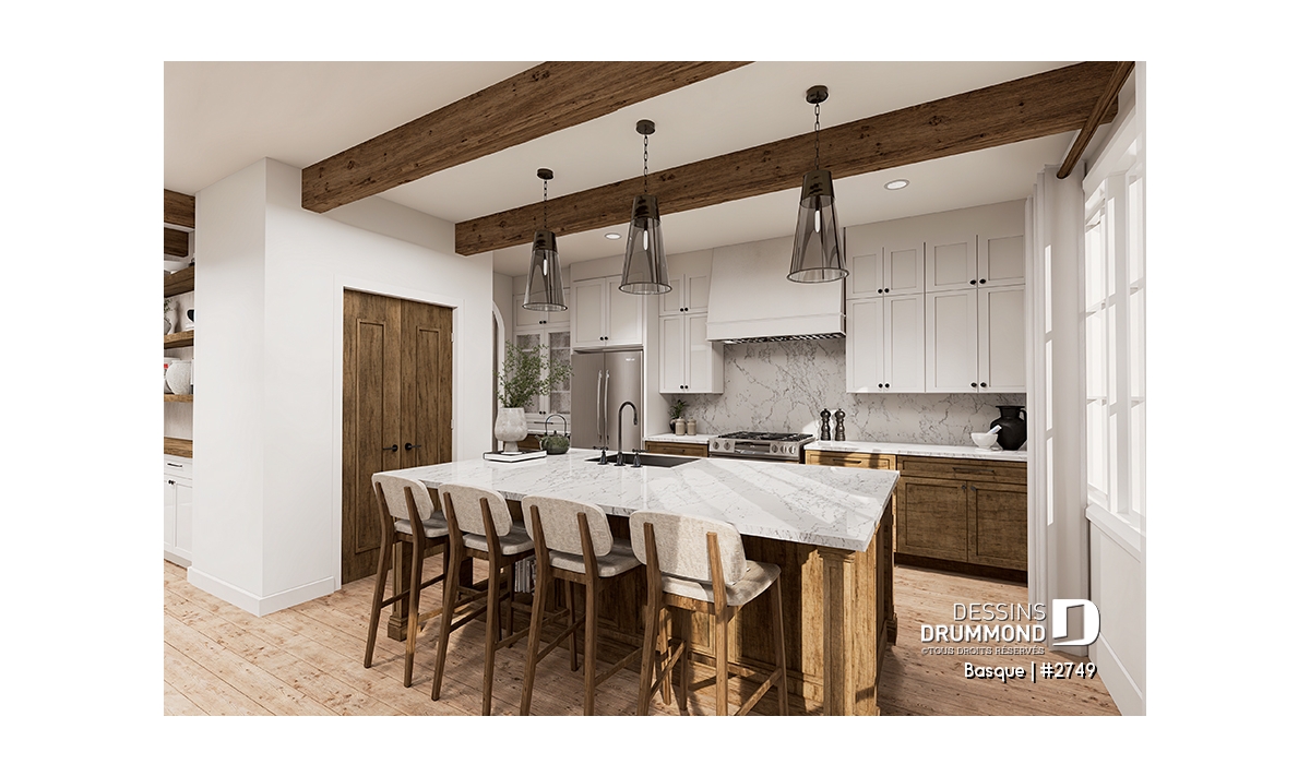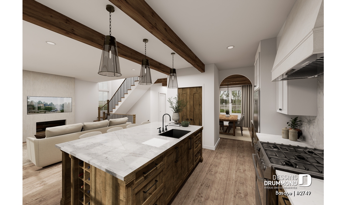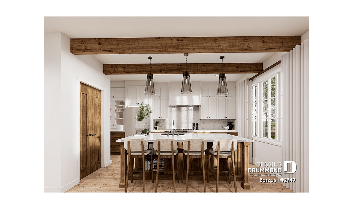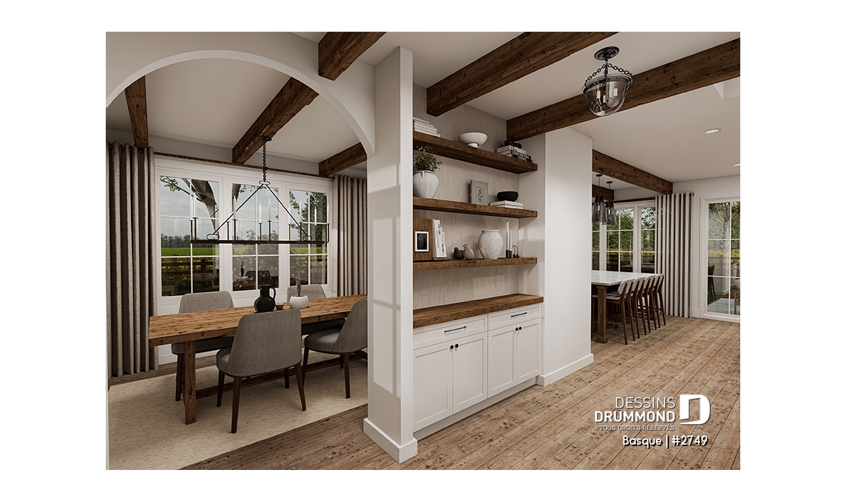 Foyer, Salle à manger formel, Salle de lavage au rez-de-chaussée, Walk-in ch. maîtres, Suite des maîtres à l'étage, Vestiaire, Garde-manger, Tablettes, Lavabo double, Arche, Plafond avec fausses poutres, Plafond à plus de 8', Ilôt, Aire ouverte, Meuble(s) encastré(s)