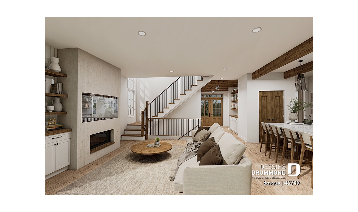 Le salon avec foyer au gaz devient le cœur de la maison. Son mobilier intégré de chaque côté du foyer ajoute une touche raffinée et pratique, transformant la pièce en un lieu chaleureux et harmonieux, propice aux soirées détentes.