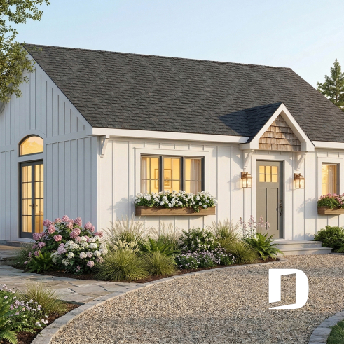 Le modèle Batiscan (#2180) est un plan de petit plain-pied pensé pour offrir un maximum de confort dans un format compact et économique. Avec ses 784 pi.ca., il s’adresse parfaitement aux premiers acheteurs, aux projets de chalet ou à toute personne souhaitant construire une maison chaleureuse avec un budget bien maîtrisé. Son style farmhouse, à la fois simple et intemporel, s’intègre facilement dans différents environnements, que ce soit en milieu urbain, en campagne ou en nature.