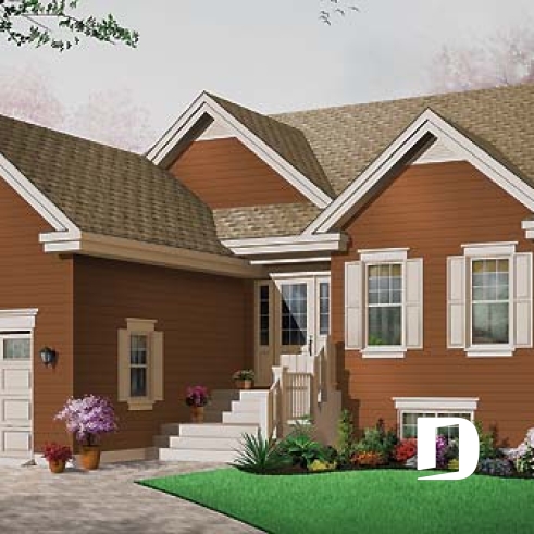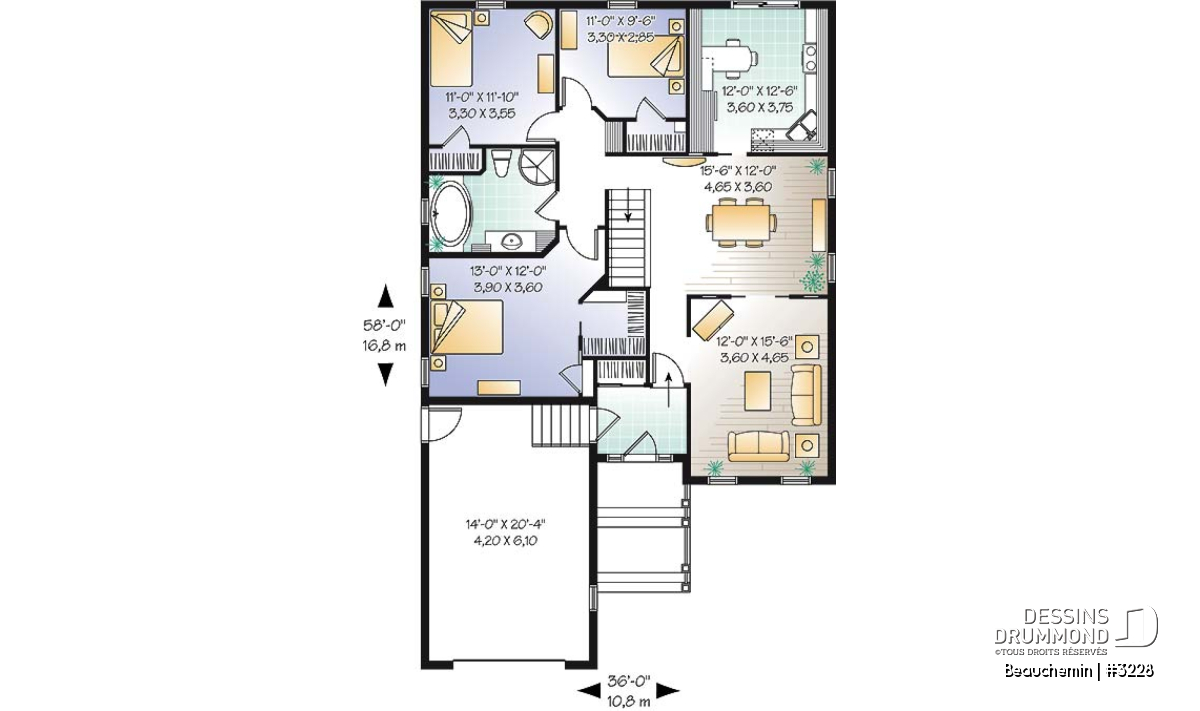 Plain-pied de 3 chambres idéal pour terrain étroit. Espace buanderie envisageable dans la garde-robe de la chambre no.3.