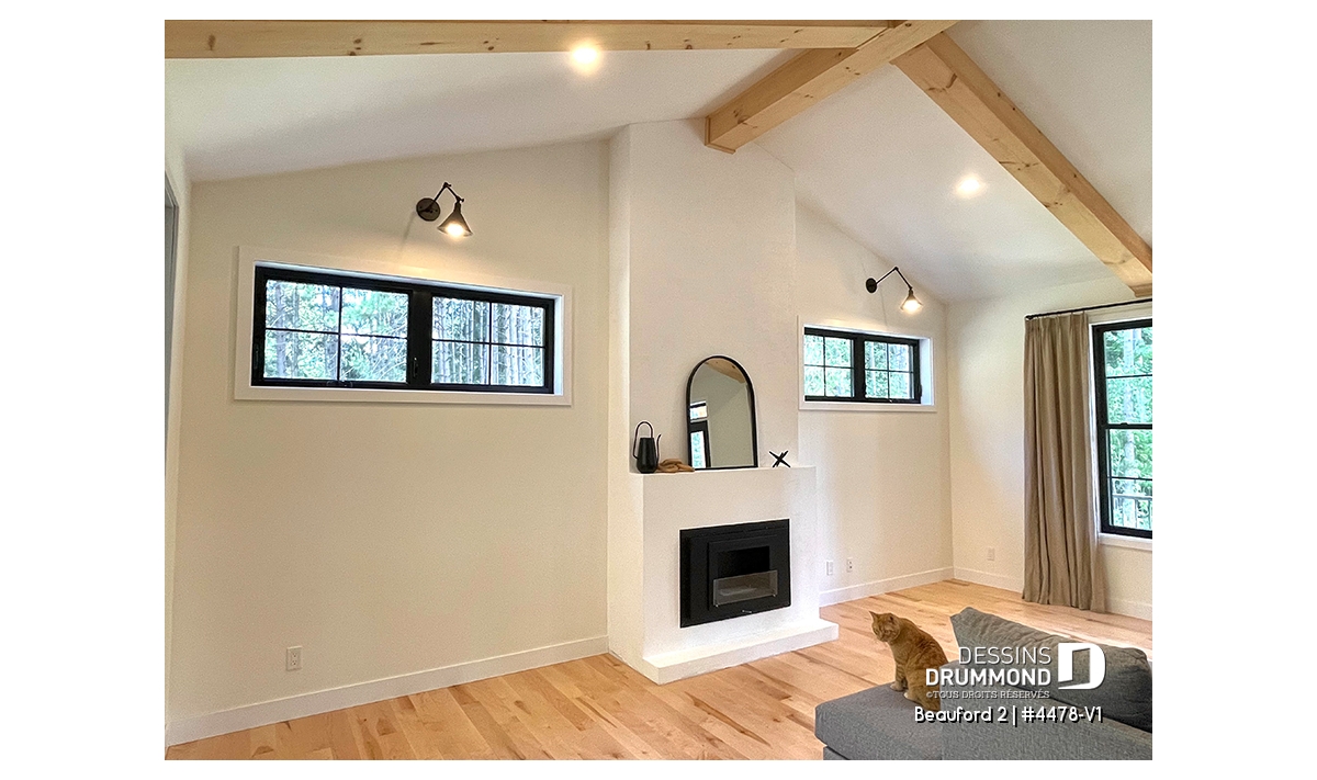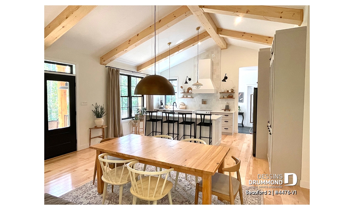 Plafond cathédrale à la cuisine, salle à manger et salon.