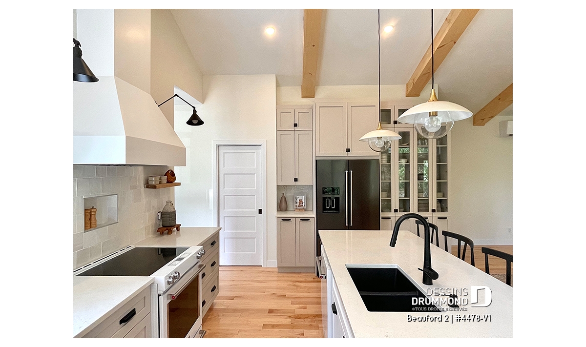 Dès l’entrée, un grand vestiaire pratique accueille les occupants et visiteurs, offrant un espace de rangement idéal pour manteaux, chaussures et accessoires. La cuisine, de généreuses dimensions, se distingue par son îlot central, parfait pour cuisiner, partager un repas rapide ou rassembler famille et amis autour d’un espace convivial. Ouverte sur la salle à manger et le salon, elle favorise les échanges et la luminosité naturelle. Le tout est sublimé par un plafond cathédrale qui accentue la sensation d’espace, ainsi qu’un foyer central qui devient le cœur chaleureux de la maison.