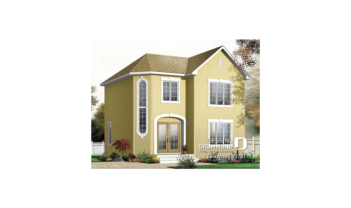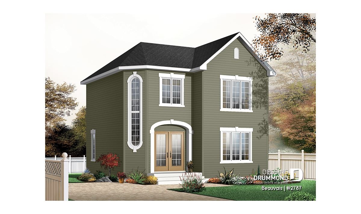 Cachet extérieur distinctif avec cette fenêtre originale permettant aussi un bien bel éclairage dans le secteur entrée principale. Belle salle de séjour et belle chambre des maîtres pour un tel format de maison. Option de deux ou trois chambres; les deux incluses au plan.