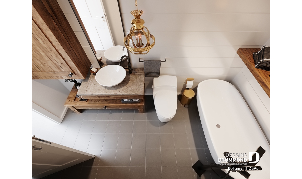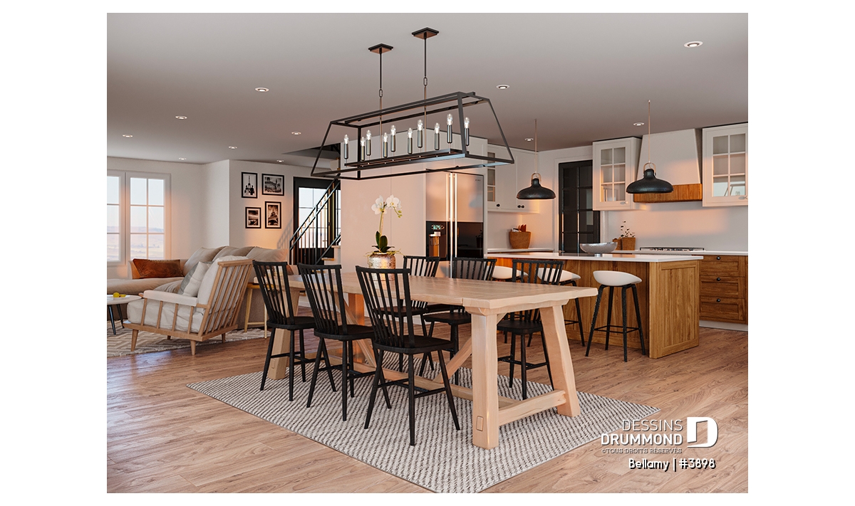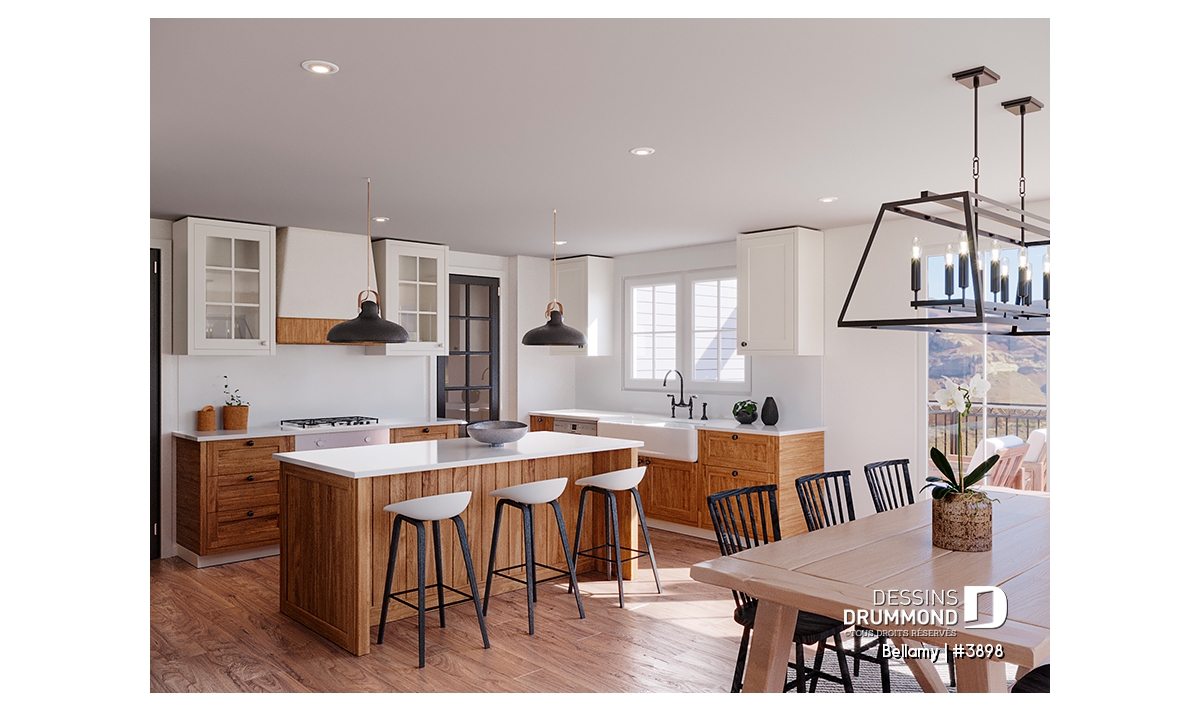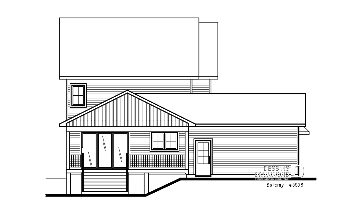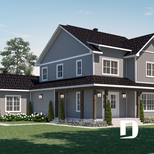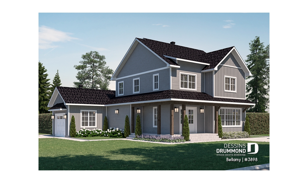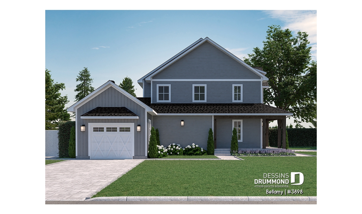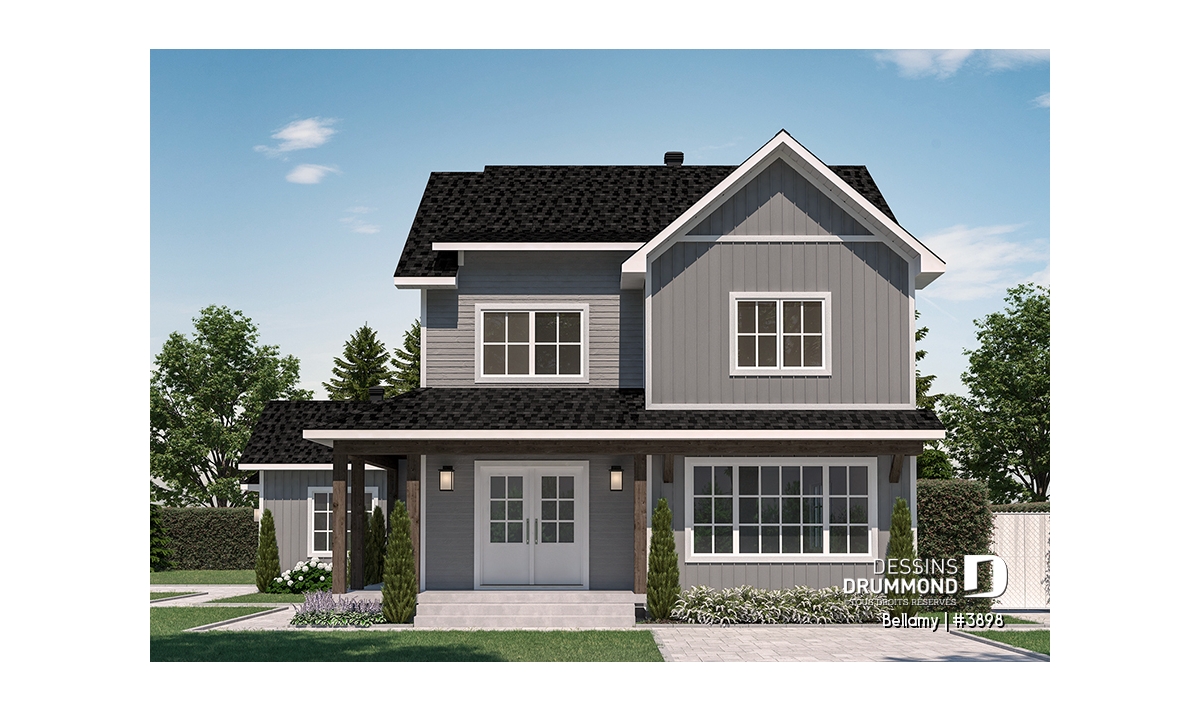 Le plan de maison Farmhouse Bellamy (#3898) propose 1914 pi.ca. aménagé sur 2 planchers, en plus d'un sous-sol qui est non fini, et à aménager selon vos besoins le moment venu. De plus cette magnifique Farmhouse propose un garage avec entrée latérale, idéal pour un terrain en coin ou un terrain de grande surface.