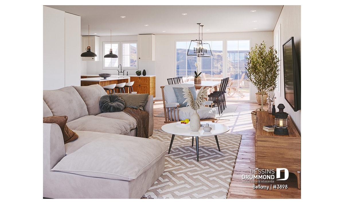 Le rez-de-chaussée est à aire ouverte et comprends une cuisine avec garde-manger, une entrée du garage avec vestiaire, un grand îlot ouverte sur la cuisine et le salon, ainsi qu'une grande terrasse abritée à l'arrière.