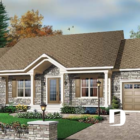 Plan de plain-pied américain 3 chambres au rez-de-chaussée, garage, grande galerie abritée à l'avant