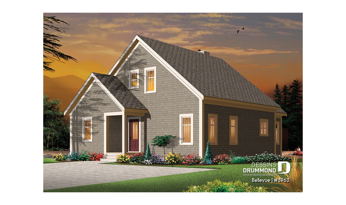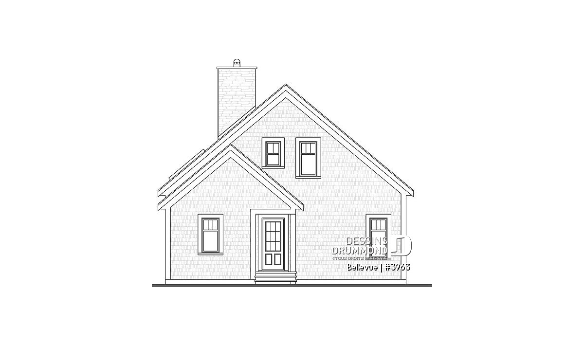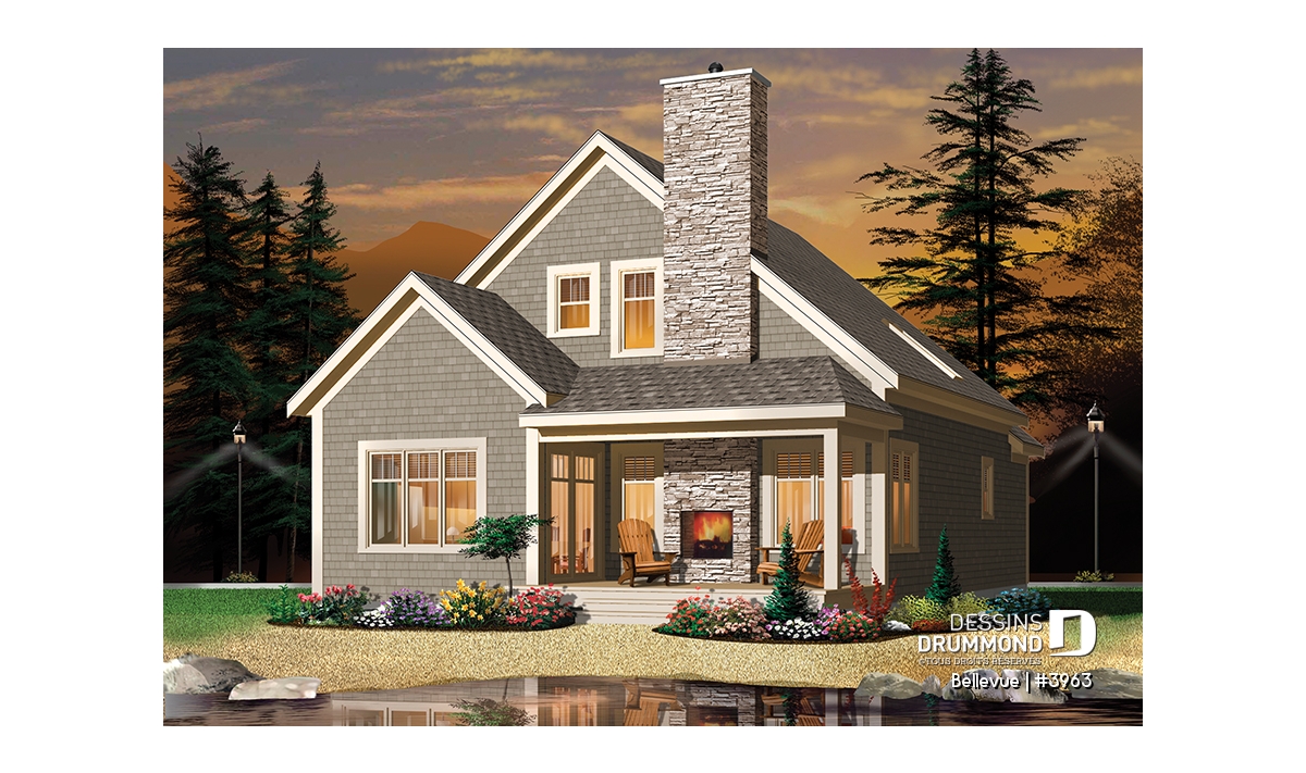 Vue arrière - MODÈLE DE BASE - Plan de maison champêtre 2 à 3 chambres, superbe terrasse abritée, foyer, mezzanine, garde-manger - Bellevue