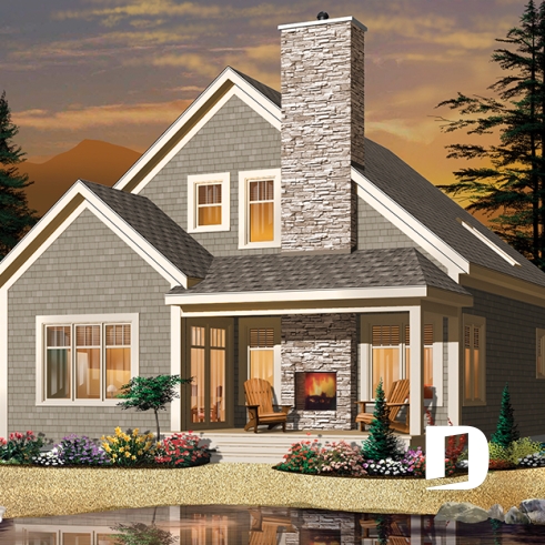Plan de maison champêtre 2 à 3 chambres, superbe terrasse abritée, foyer, mezzanine, garde-manger