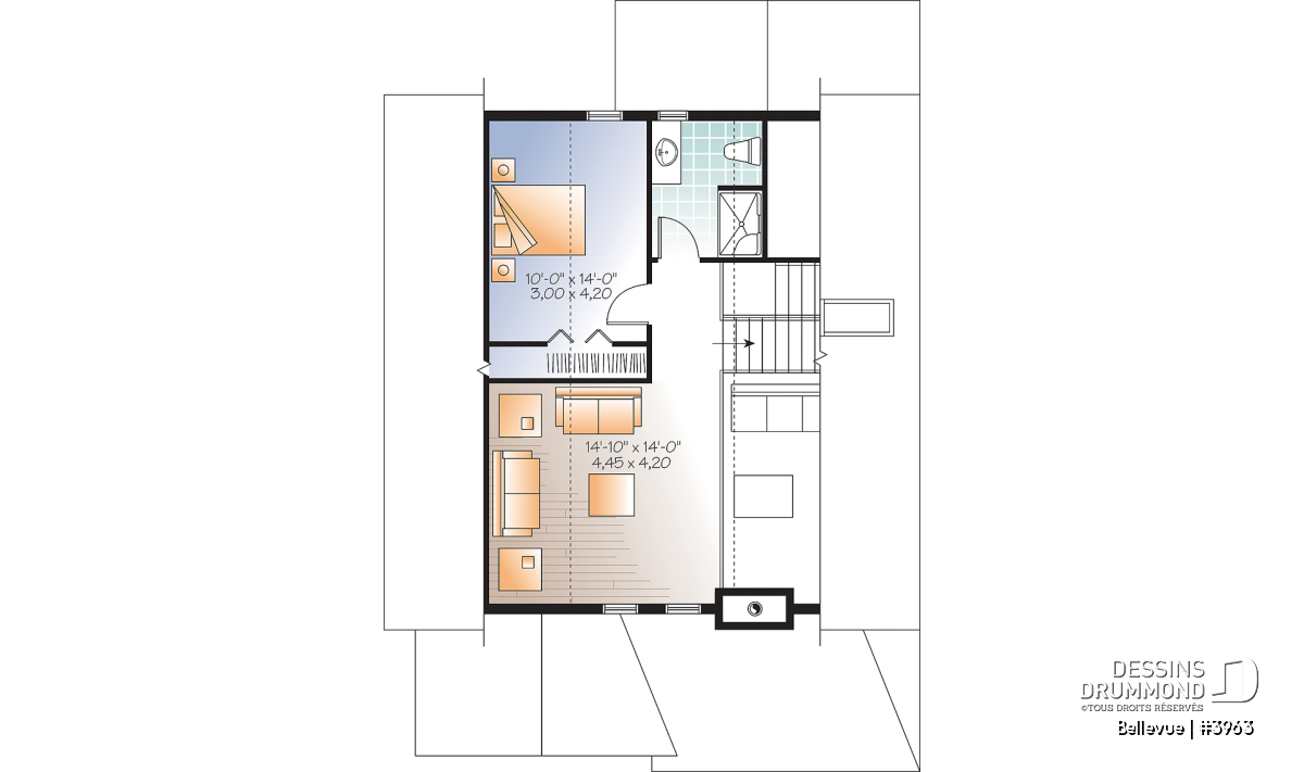 Étage - Plan de maison champêtre 2 à 3 chambres, superbe terrasse abritée, foyer, mezzanine, garde-manger - Bellevue