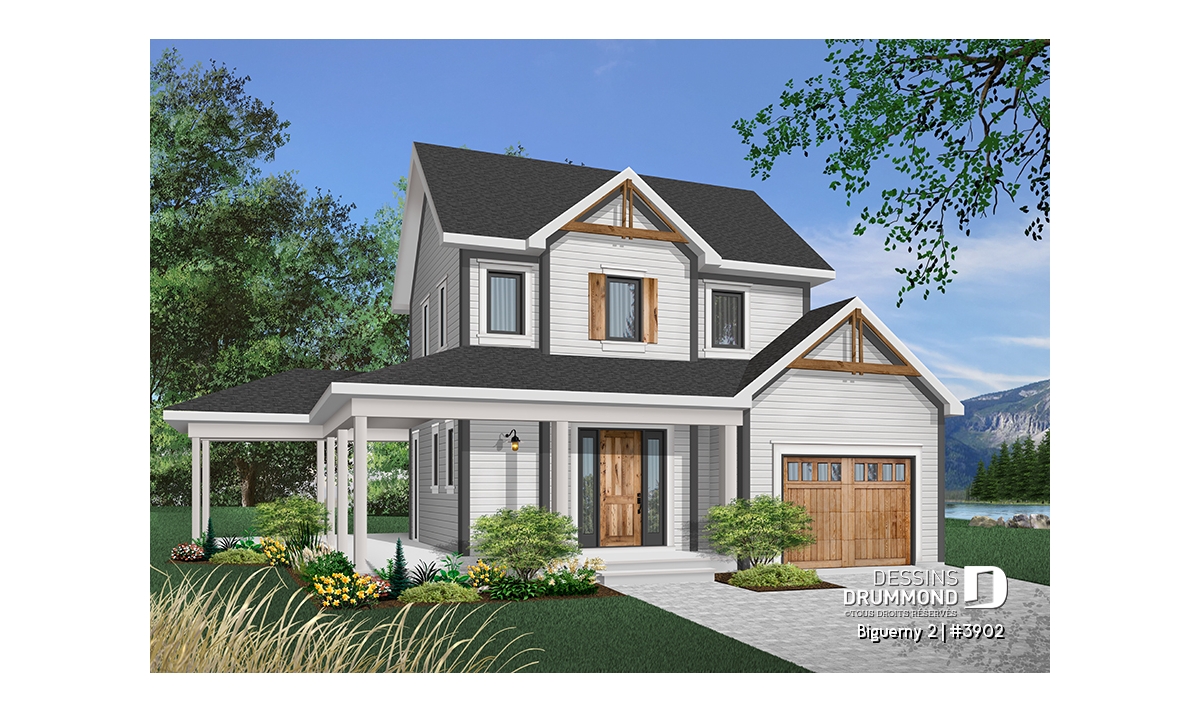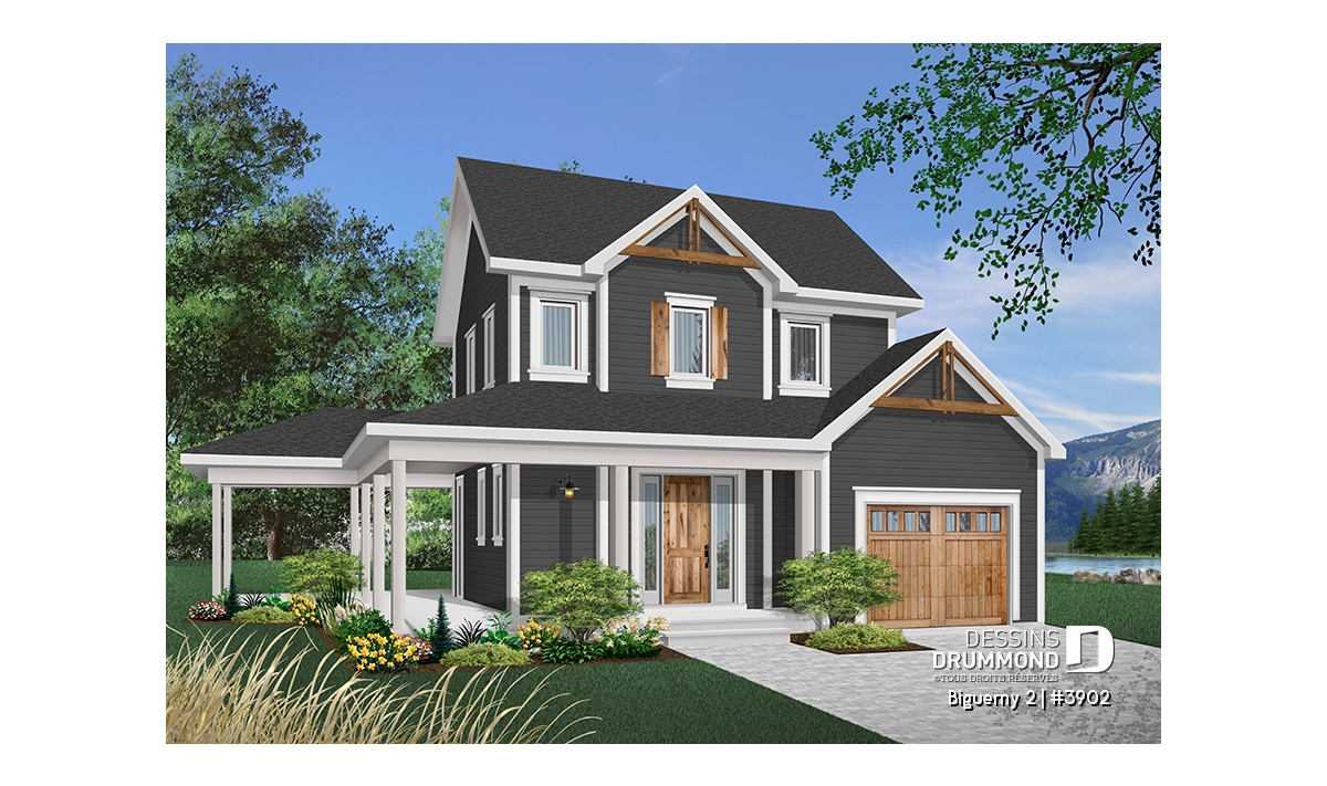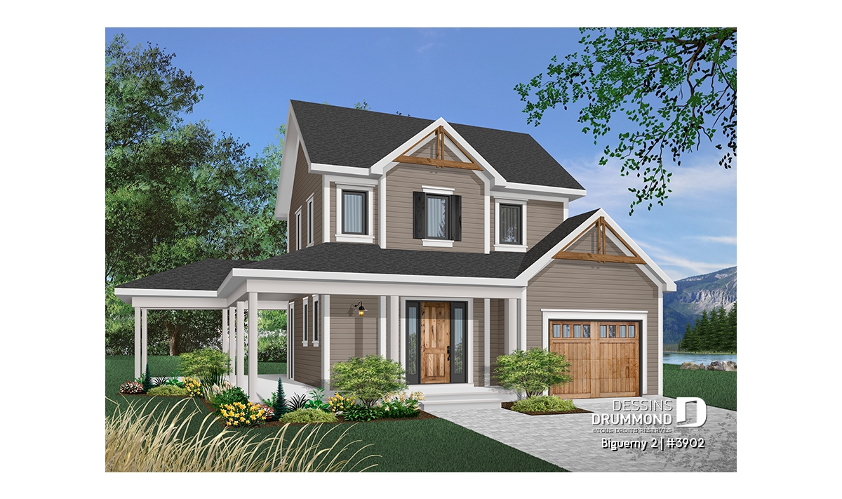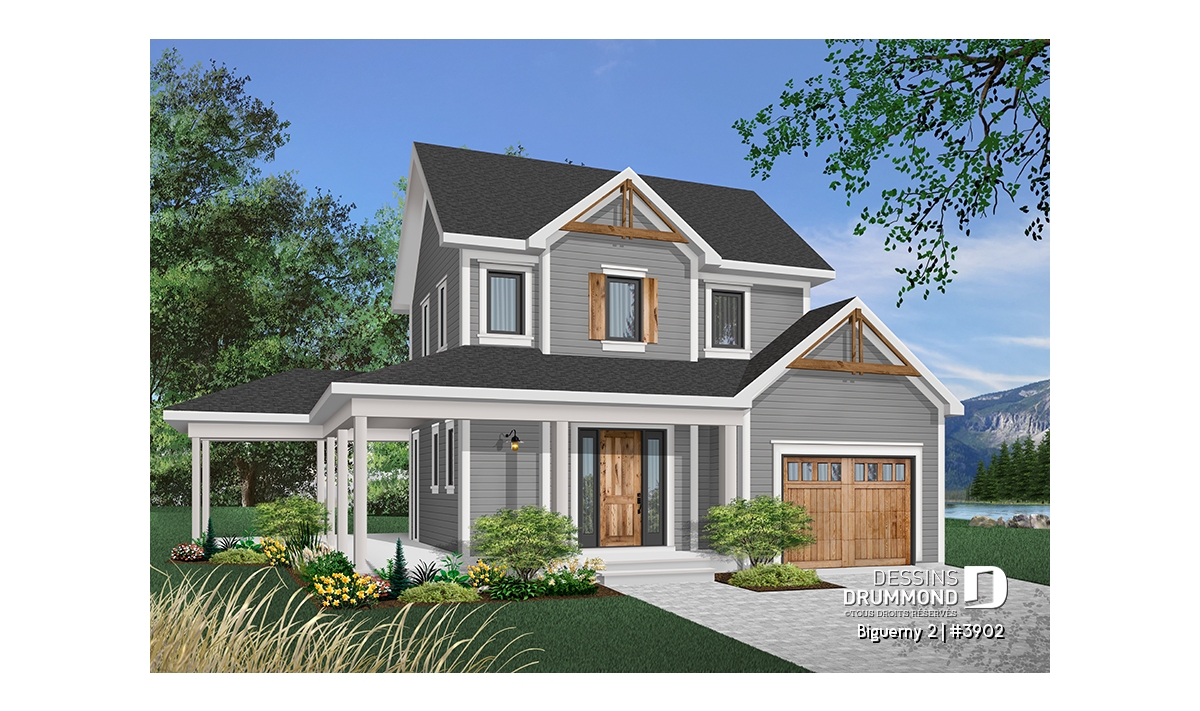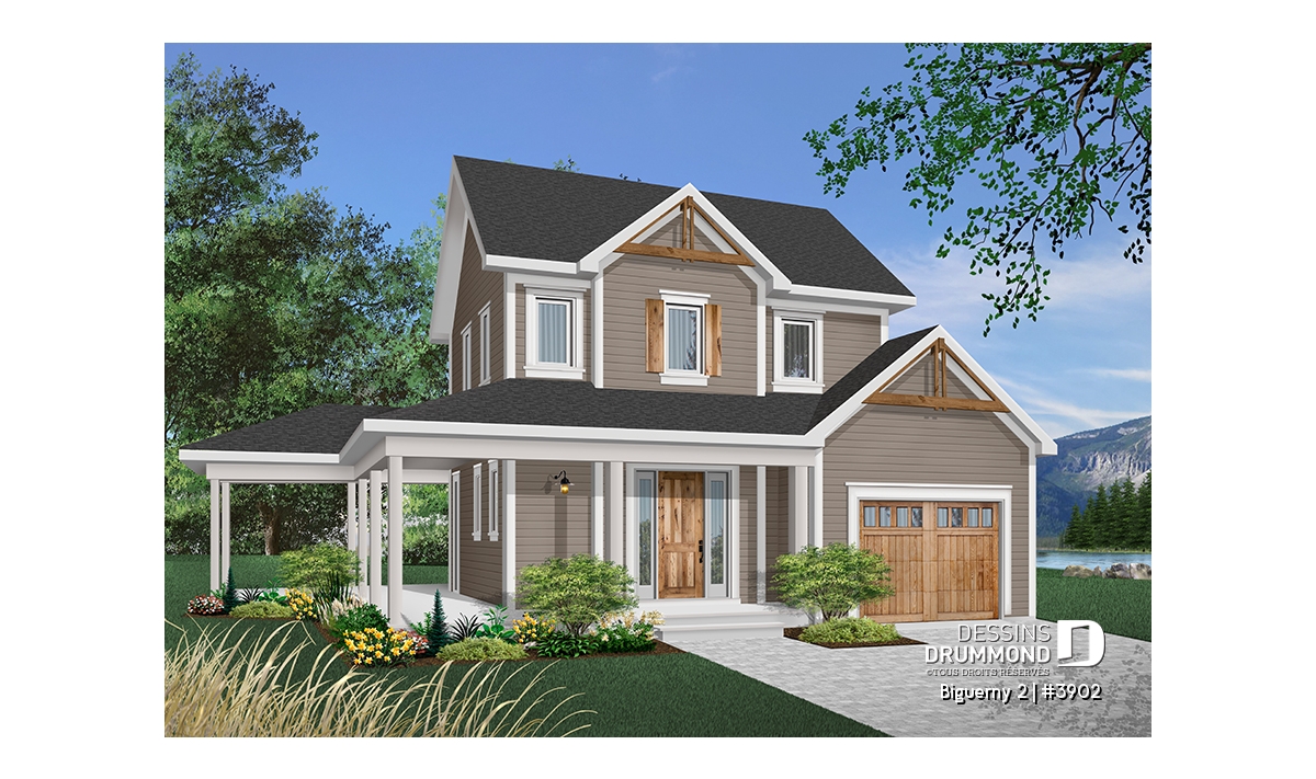Avec seulement 28 pieds de largeur en façade principale, excluant les galeries, on peut qualifier ce cottage d'original à double vocation car il conjugue l’aspect urbain, avec son garage bien intégré, à une approche champêtre pour site panoramique avec ses galeries et son aménagement intérieur orienté sur l’arrière. Le modèle 2937 dont il est issu se veut d’ailleurs la source de quelques autres modèles similaires dont la popularité ne cesse de croître.