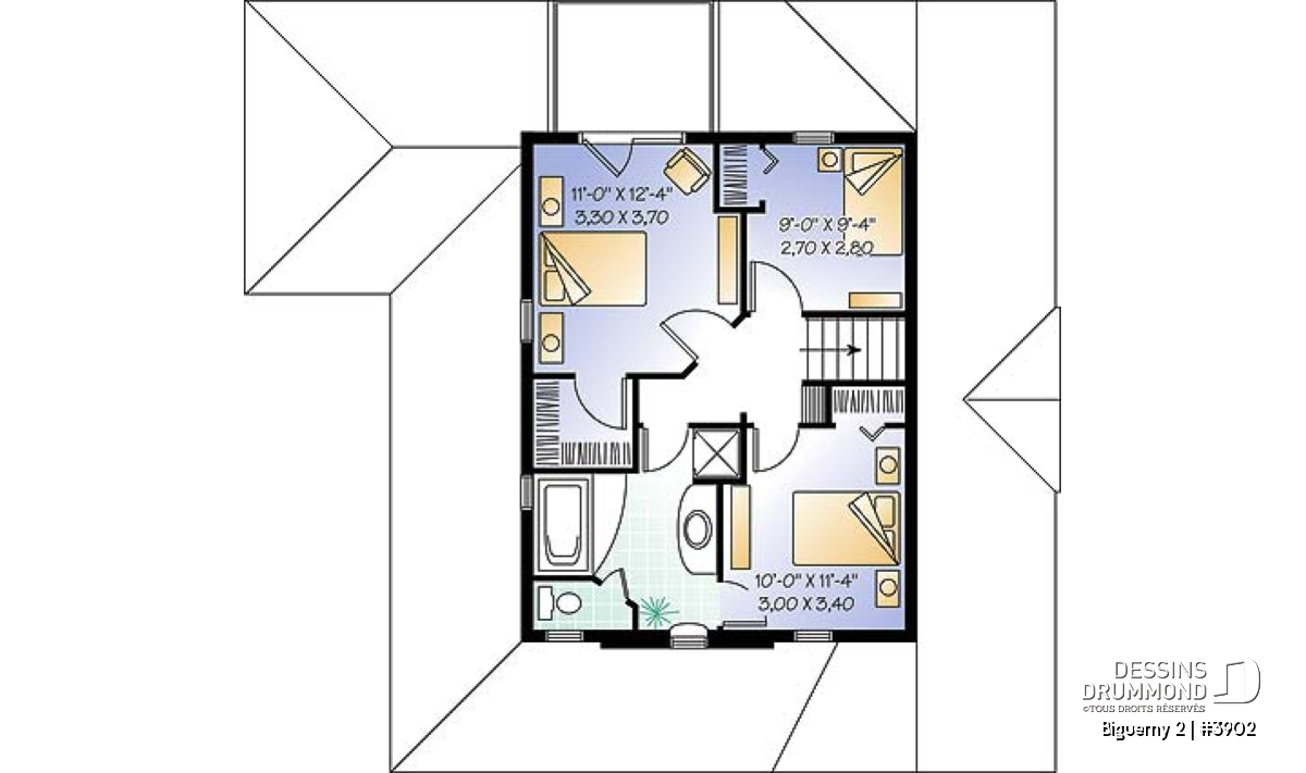 À l’étage, où on se rend en empruntant l’escalier donnant directement dans la salle de séjour, pour une maximisation de l’espace intérieur, on apprécie les deux options qui s’offrent à nous soit une version 2 chambres et une version 3 chambres ( toutes deux incluses au plan ). Pour chacune d’elles d’ailleurs, la chambre des maîtres retient notre attention avec sa garde-robe de type « walk-in » et son balcon extérieur donnant sur l’arrière et sur son potentiel panoramique.