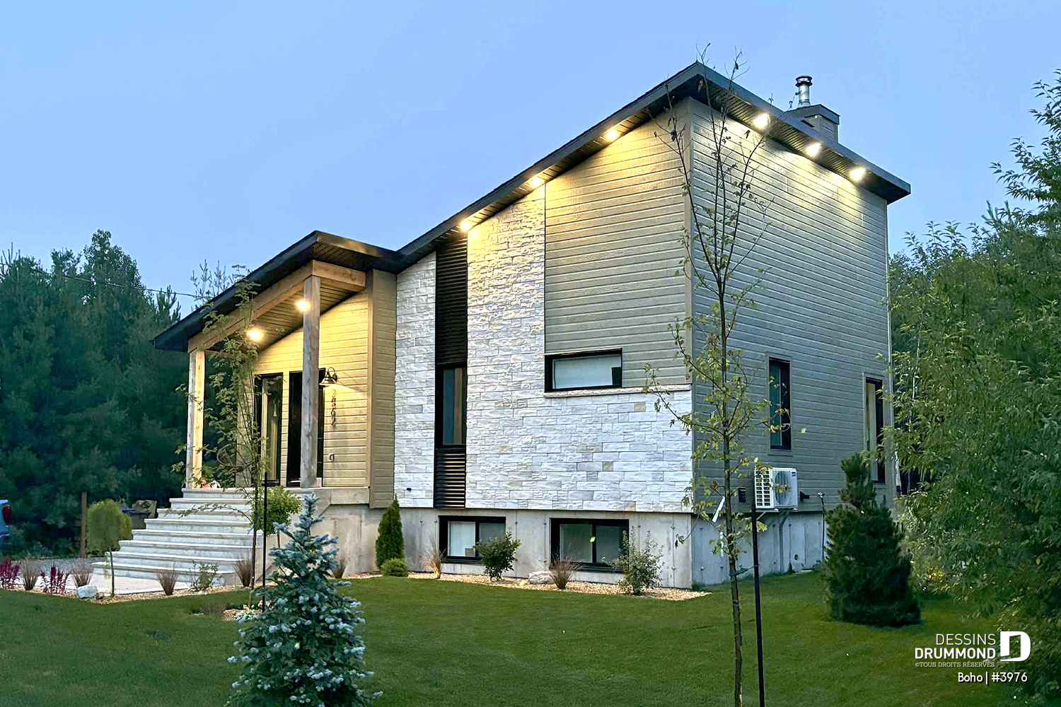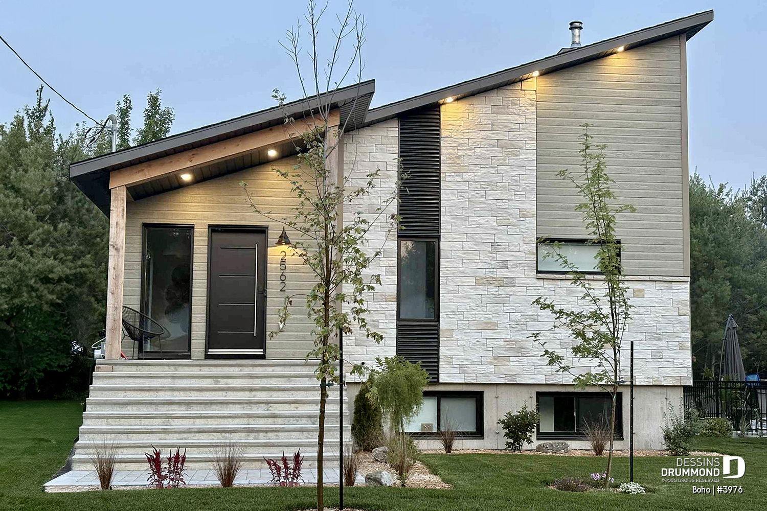 Les estimations de maison incluent les revêtements tels qu'illustrés sur notre site. Les maisons modestes sont calculées avec un revêtement de clin régulier en vinyle. Pour les maisons régulières et plus complexes, nous ajoutons des montants approximatifs (au pi.ca.) : clin de fibrociment, de cèdre, maçonnerie légère ou régulière (partiel ou total), board & batten, bois, et autres. Les poutres de bois illustrées sur l'extérieure de nos maisons sont aussi incluses dans le coût, mais elles sont «capées » et non en bois massif. Il en est de même pour les portes d'entrée et portes de garage. Elles sont incluses aux estimations, mais de qualité standard. Concernant les revêtements de maçonnerie : on propose, sur plusieurs modèles, une touche de brique-pierre comme on en retrouve chez la plupart des fabricants de brique (faire attention de ne pas confondre avec de la pierre naturelle, rarement sur nos illustrations et beaucoup plus dispendieuse). NOTE : Si vous souhaitez utiliser un revêtement de maçonnerie plutôt qu'un clin comme illustré sur le plan que vous avez choisi, svp nous contacter car vous aurez besoin de faire modifier le plan en conséquence.