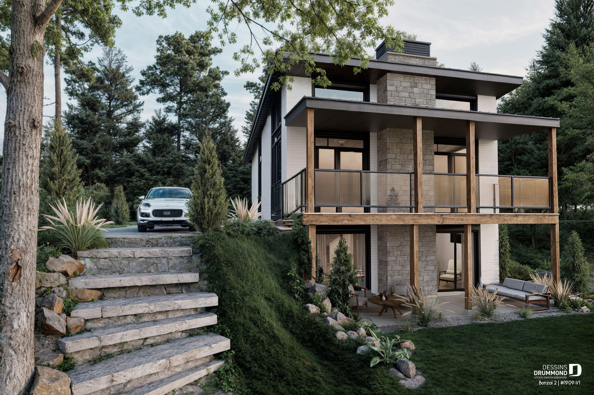 Parfaitement adapté à un terrain en bord de lac ou en montagne, ce plan met en valeur la façade arrière entièrement fenestrée, offrant une vue dégagée et une luminosité exceptionnelle. Deux terrasses abritées — une à chaque étage — permettent de profiter pleinement de l’extérieur, beau temps mauvais temps. Les aires de vie communes (cuisine, salon, salle familiale) sont toutes regroupées à l’arrière, et baignées de lumière naturelle grâce aux porte-patios.