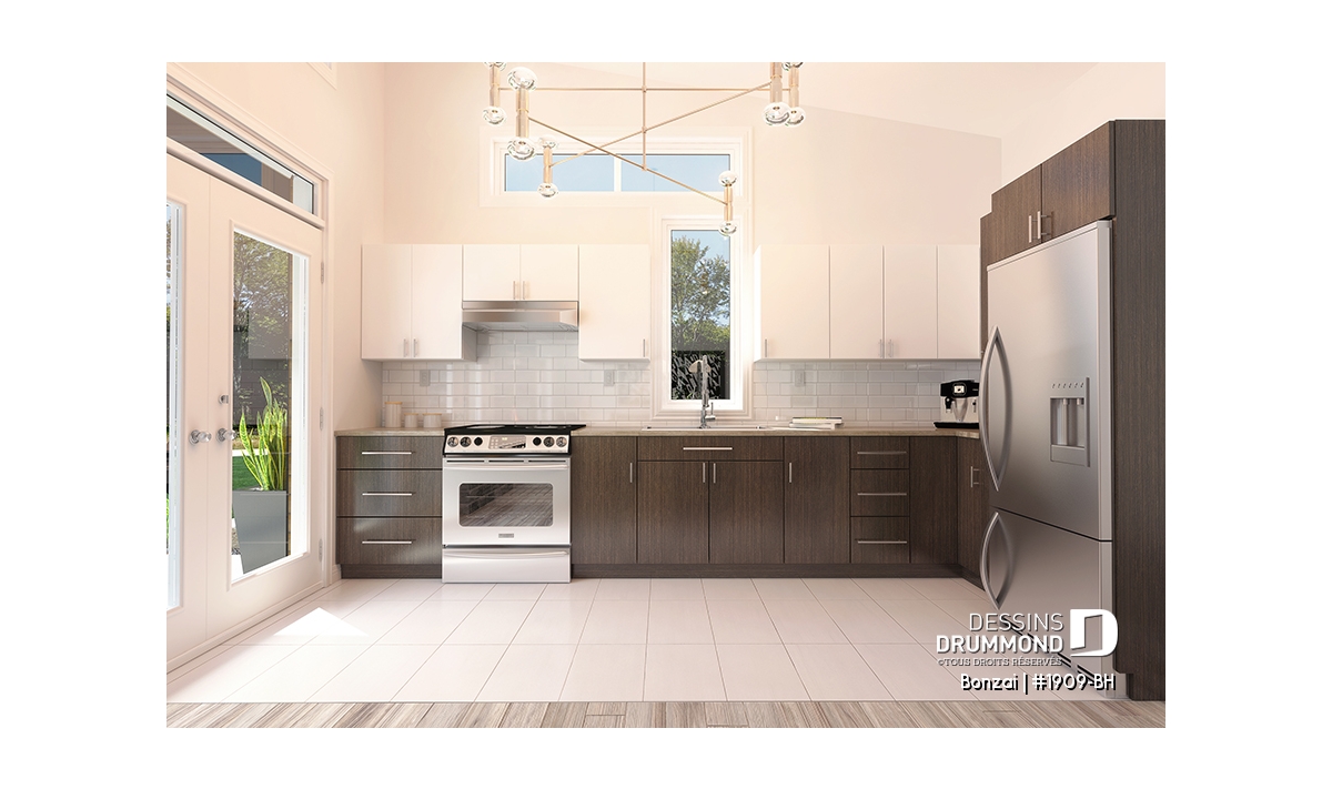 De grandes fenêtres, placées au-dessus du patio, inondent la pièce principale de lumière naturelle.