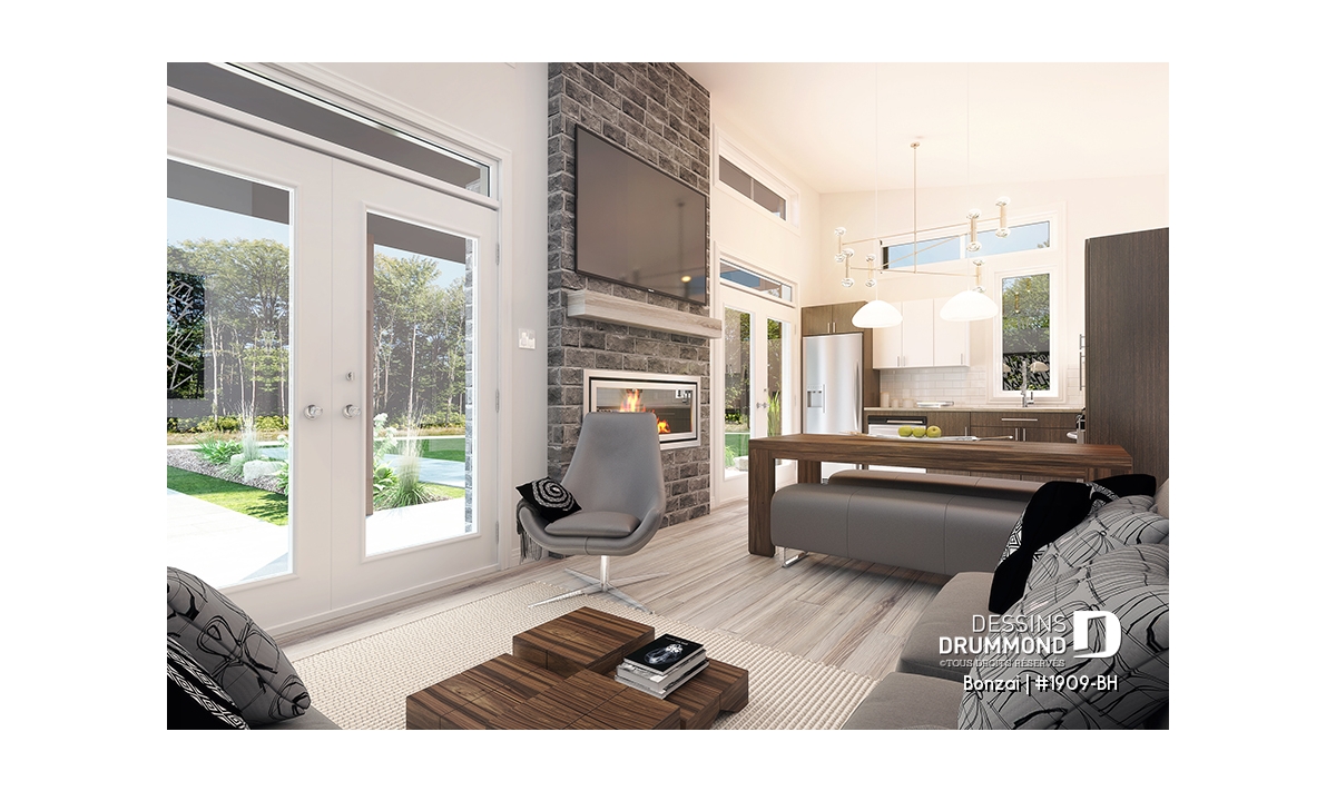 Espace de vie à aire ouverte avec un foyer central, parfait pour créer une ambiance conviviale.