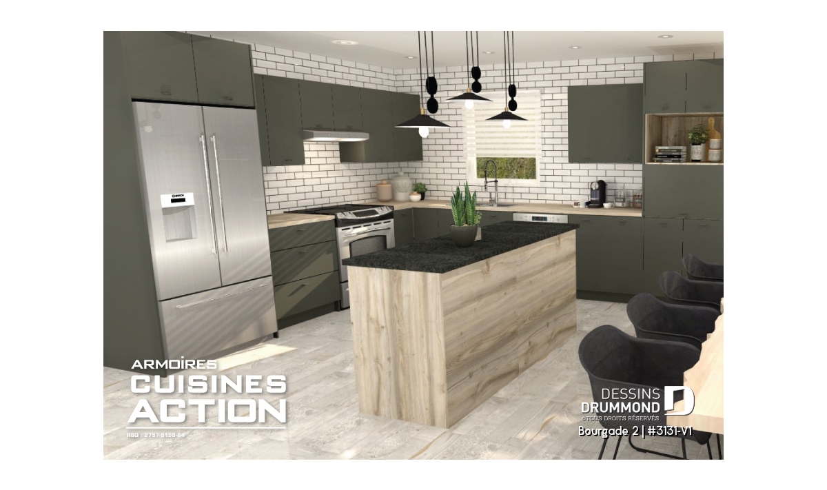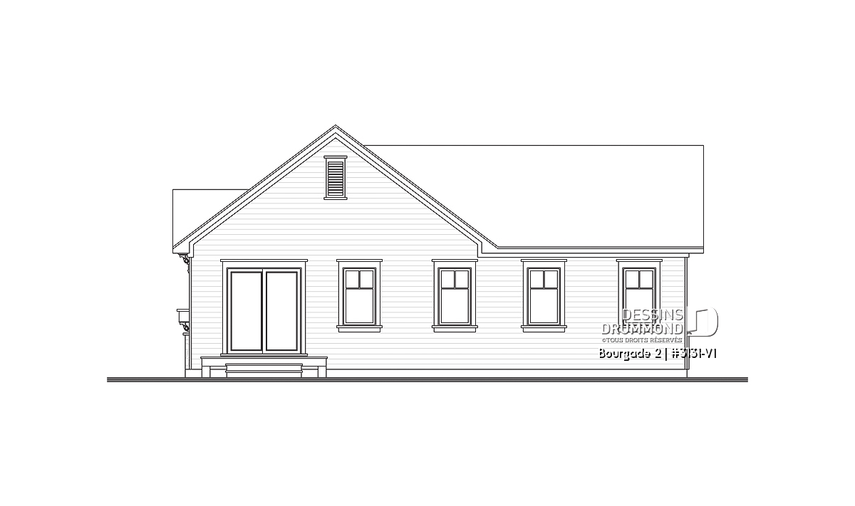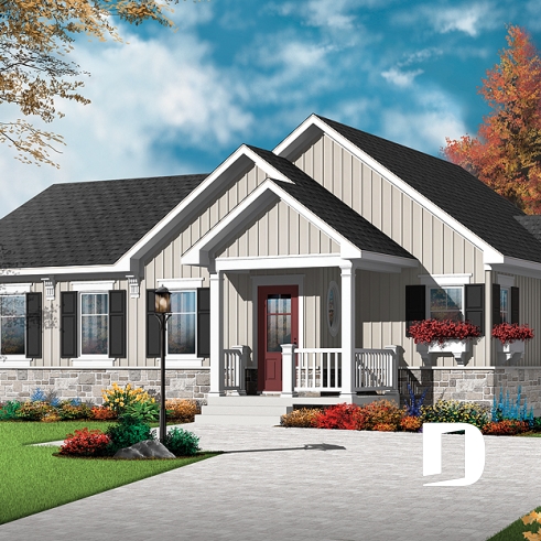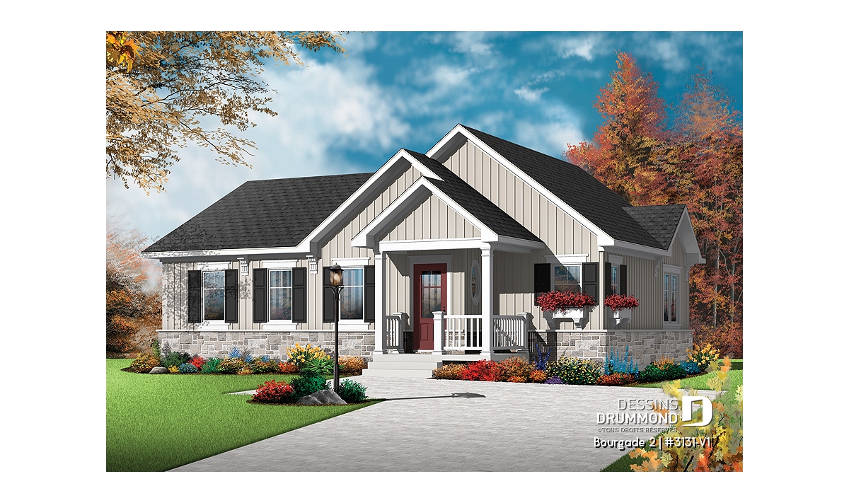 Fort apprécié comme plain-pied de 3 chambres sous le numéro 3131, ce plan a suscité beaucoup d'intérêt chez les clients désireux de construire celui-ci en version 2 chambres. Voilà donc pourquoi Dessins Drummond suggère cette version attendue pour laquelle, mis à part l'élimination d'une chambre, quelques changements sont apportés afin de donner un caractère propre à ce modèle. Ainsi, à l'extérieur, dans une recherche de style artisanal (Craftsman), le clin de vinyle qui recouvre le plan original 3131 sur quatre façades fait place ici, sur les façades Avant et Droite, à une base en pierre d'environ 36po de hauteur jumelée à un parement vertical de bois avec languettes pour un cachet véritablement différent et un style de plus en plus prisé de certains acheteurs. À l'intérieur, l'élimination de la troisième chambre permet l'agrandissement de chacune des pièces que ce soit la cuisine avec son îlot-lunch encore plus logeable ou bien la chambre des maîtres avec sa garde-robe aux allures de walk-in, on se doit signaler aussi cette chambre secondaire dans laquelle on peut désormais aménager un lit double. Sans oublier, la grande gagnante qu'est la salle de bain avec l'intégration du coin laveuse/sécheuse et une douche indépendante de 3pi x 5pi à la fois vitrée et attenante au bain comme on en voit de plus en plus dans les intérieurs contemporains.