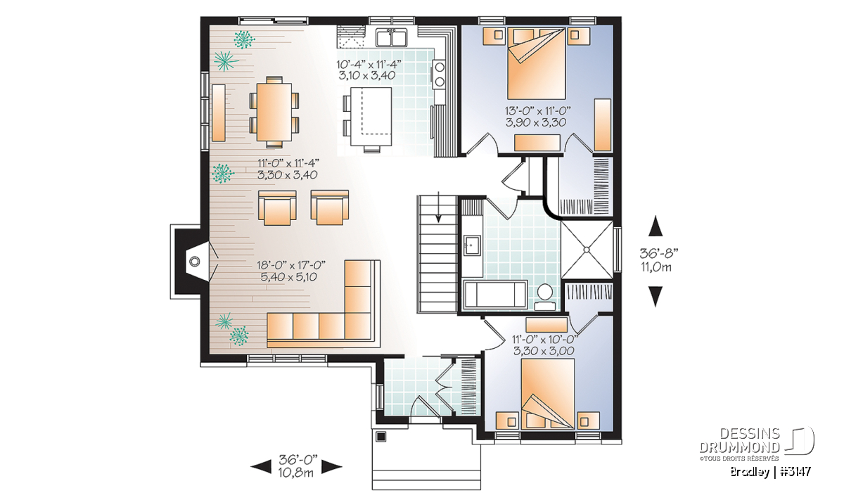 | Largeur | 36'0" | Profondeur | 36'8" |