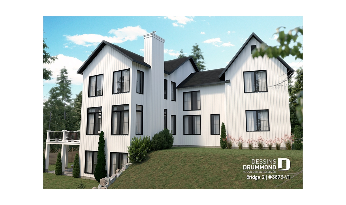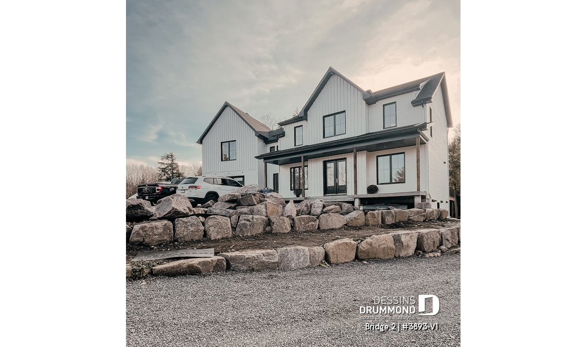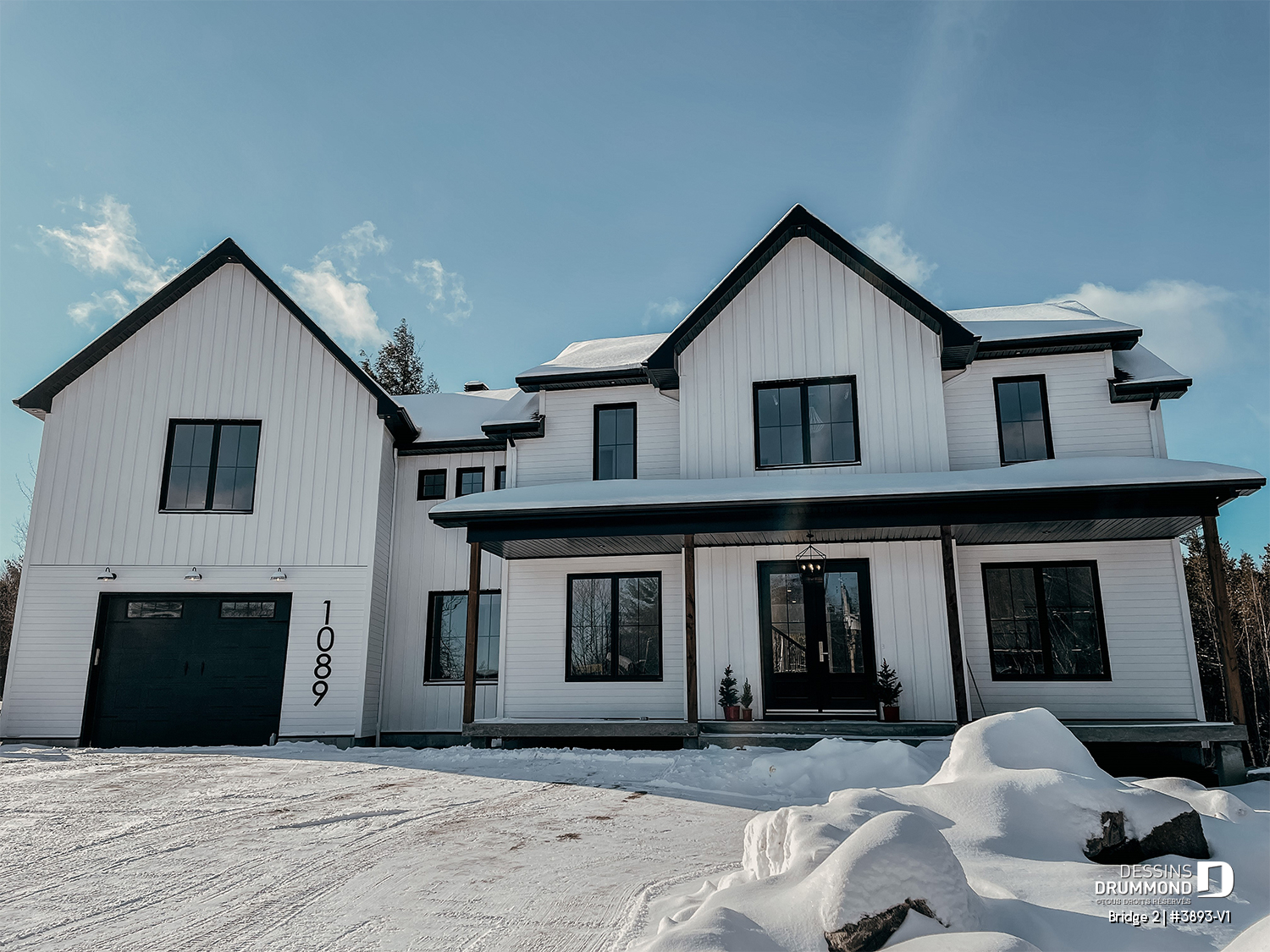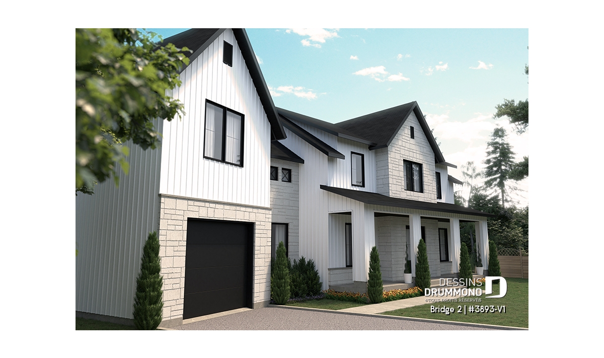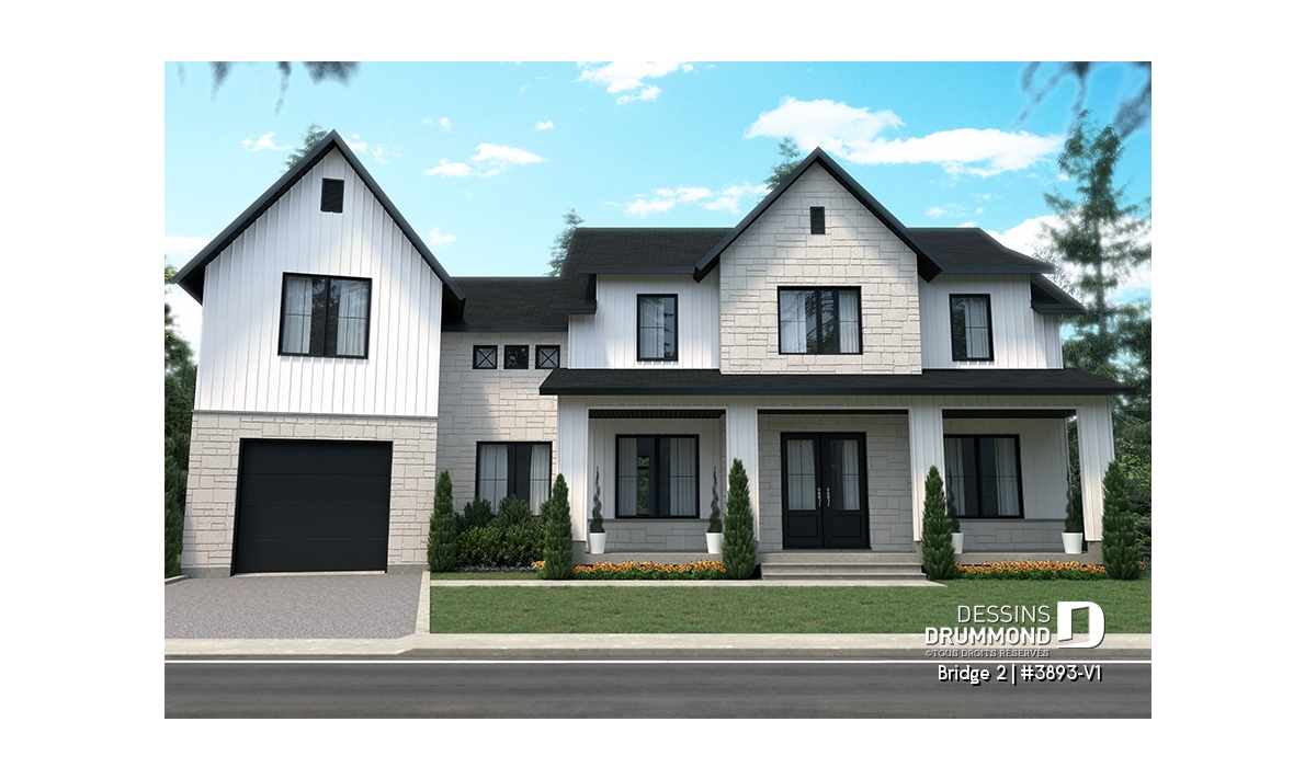 Découvrez le superbe plan de maison de style farmhouse BRIDGE 2 (#3893-V1) avec garage, proposant un confortable 3313 pi.carré de surface aménagée, en plus d'un sous-sol non fini de type rez-de-jardin, additionnant au besoin, 1435 pi.ca. à aménager.