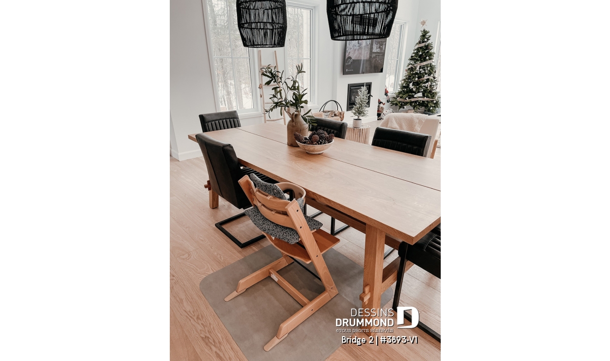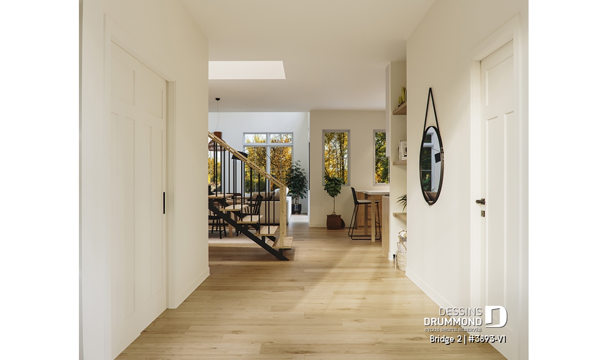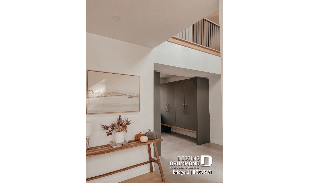Le rez-de-chaussée et l’étage ont des plafonds à 9’ de hauteur, sauf au salon, où l’on y retrouve un plafond de près de 20’ de hauteur. Le balcon avant abrité s’ouvre sur un vaste hall d’entrée avec grande garde-robe pour les invités à gauche et une grande salle de lavage à droite. L’accès du garage propose qu’en à lui un grand vestiaire qui sera assurément très pratique à la famille. Un bureau à domicile est aménagé à l’avant de la maison et en retrait des espaces de vie. La cuisine possède un garde-manger de type walk-in et un grand îlot, ainsi qu’un comptoir de type bar à café. La salle à manger est ouverte sur la cuisine d’un côté, et sur la salle de séjour de l’autre. Ce dernier est d’une impressionnante hauteur de près de 20’ avec foyer et beaucoup de lumière naturelle et donne aussi accès à la grande terrasse de 17’ x 16’.