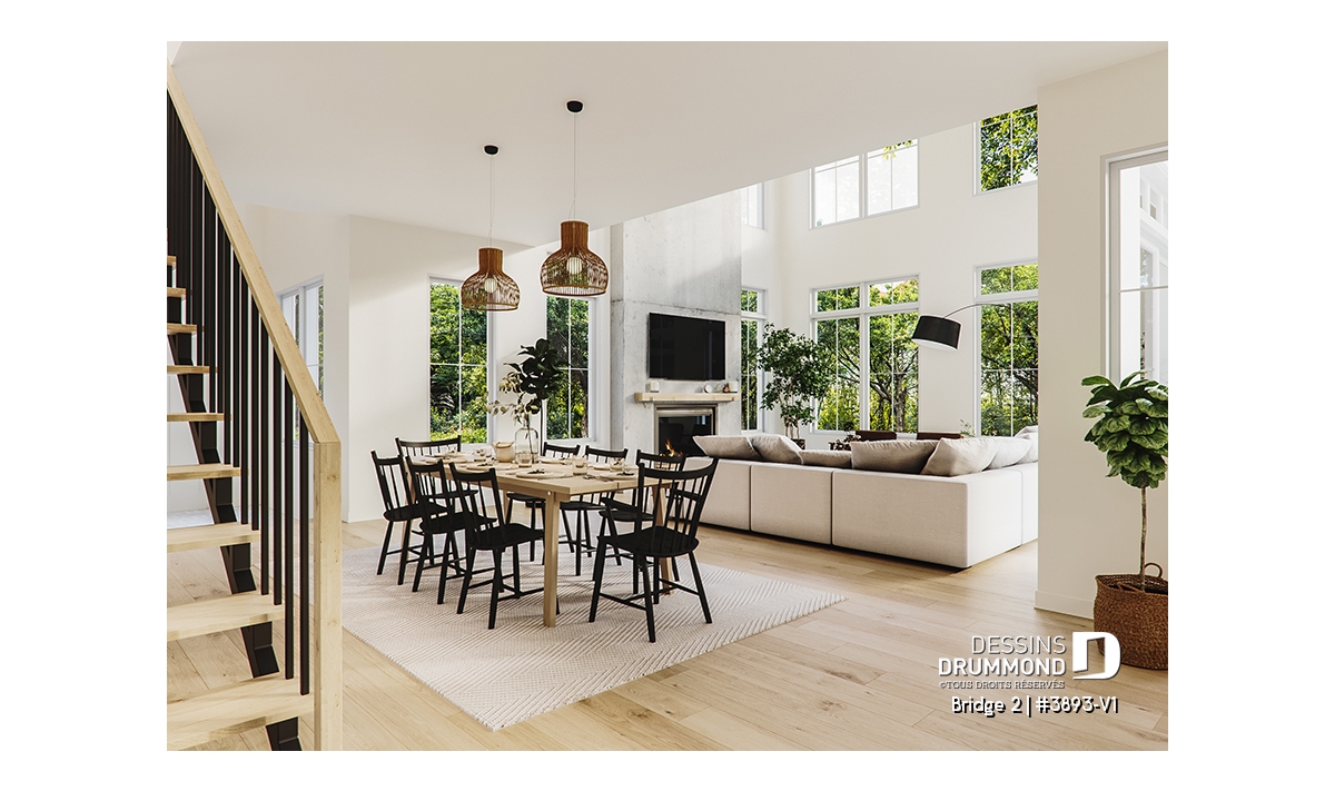 Salle de séjour avec foyer sur 2 étages de hauteur et plafond à approx. 20'.