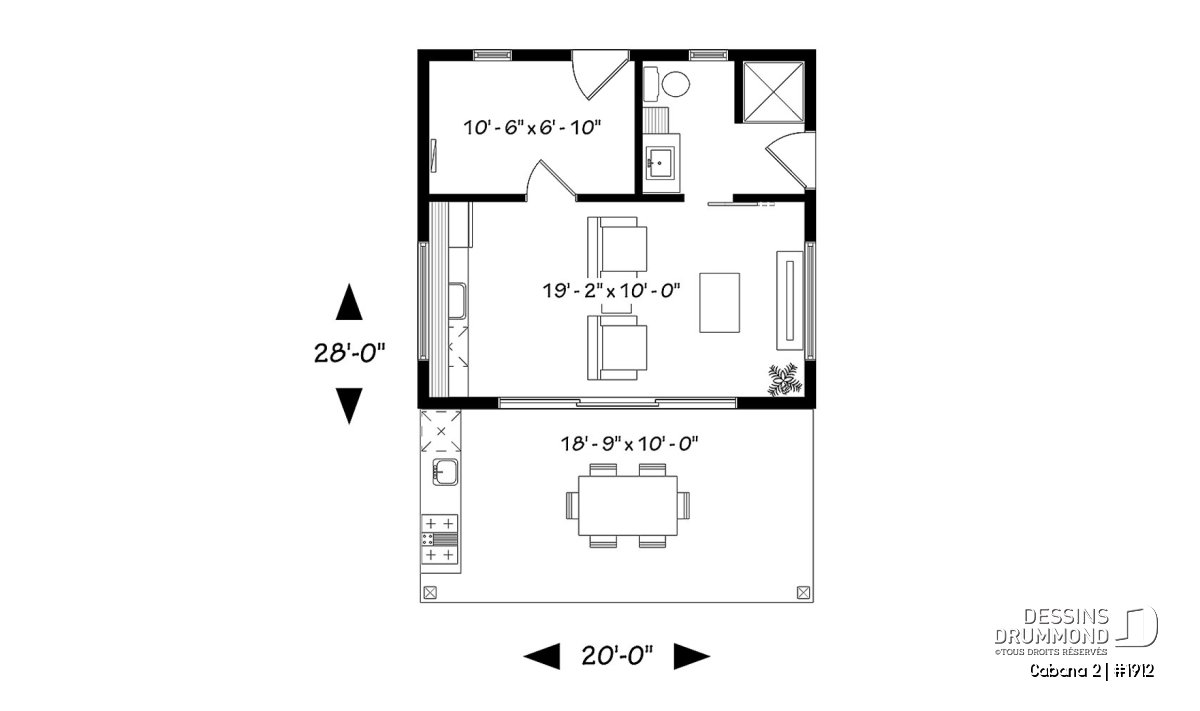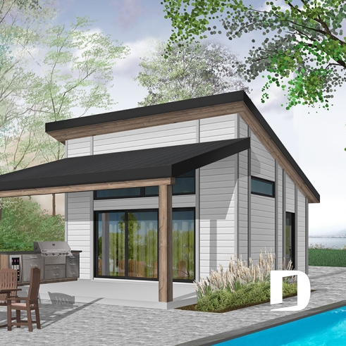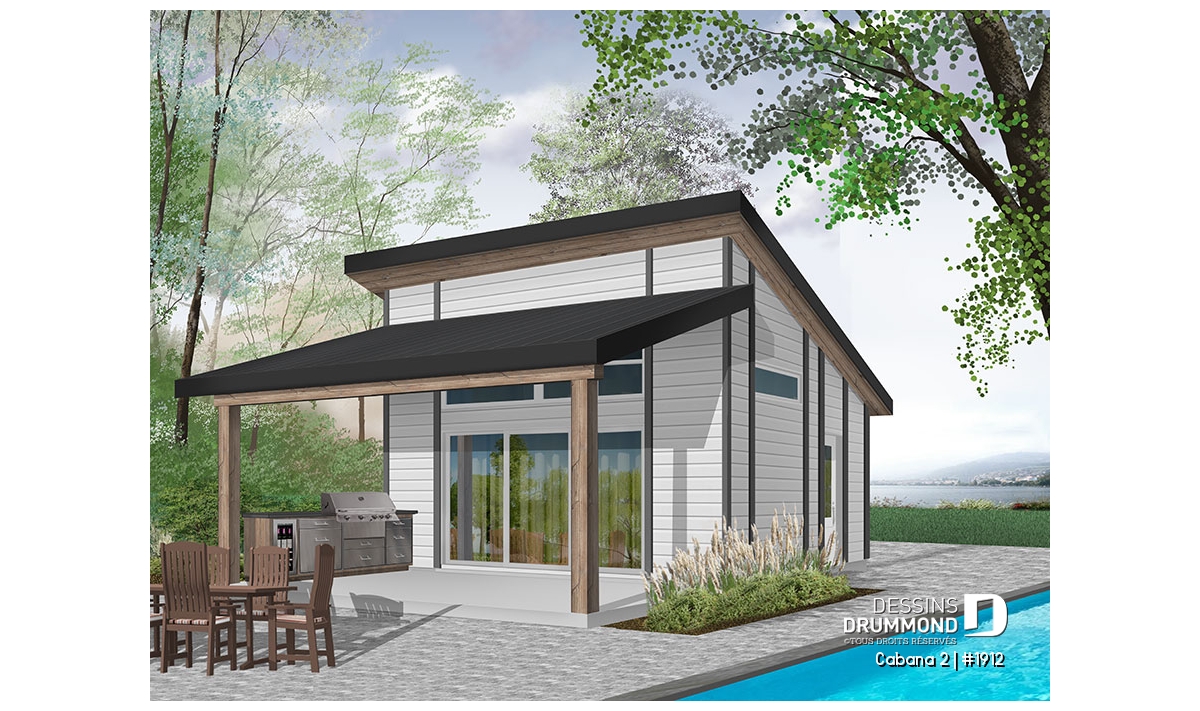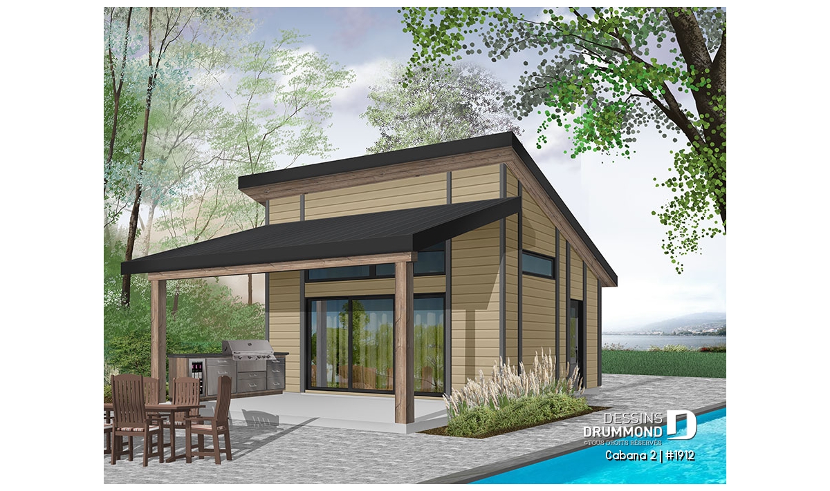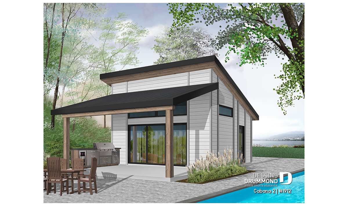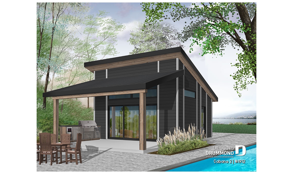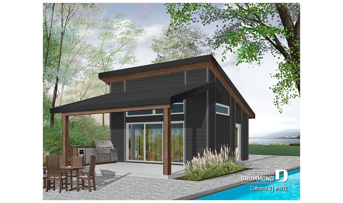 Ce nouveau plan de pavillon de jardin de Dessins Drummond, ou grand cabanon pour piscine, vous procurera de l’espace habitable et rangement supplémentaire, durant la belle saison. En effet, ce nouveau modèle de pavillon « Le Cabana » ou plan # 1911 de Dessins Drummond, offre plusieurs commodités à ne pas passer sous silence, tel sa grande terrasse couverte. Cette dernière est suffisamment grande pour contenir un coin cuisine avec BBQ, évier et réfrigérateur. De plus, un coin salle à manger extérieur, avec espace suffisant pour recevoir une table de 6 à 10 personnes, est bien pratique avec son toit. Une télévision pourrait même être installée à l’extérieur et des fauteuils pourraient remplacer la table, à vous de choisir!
