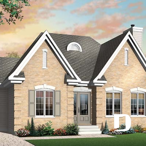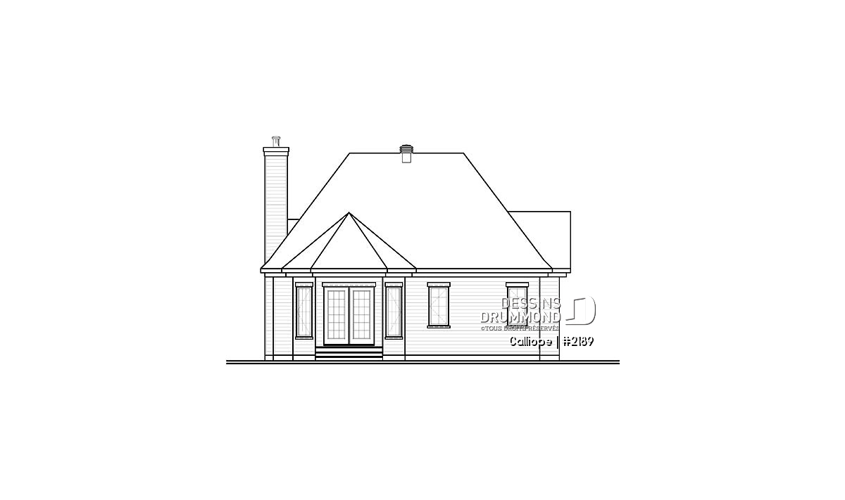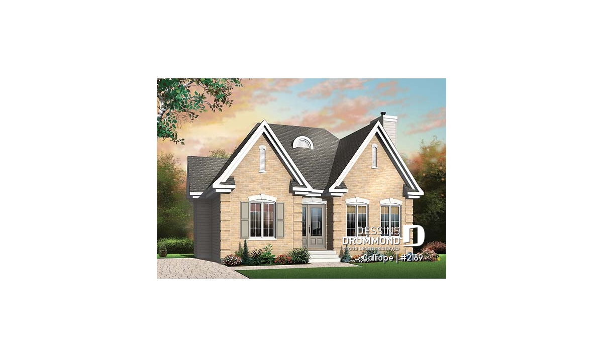 Vue avant - MODÈLE DE BASE - Plan de maison économique, 2 chambres, séjour remarquable avec foyer - Calliope