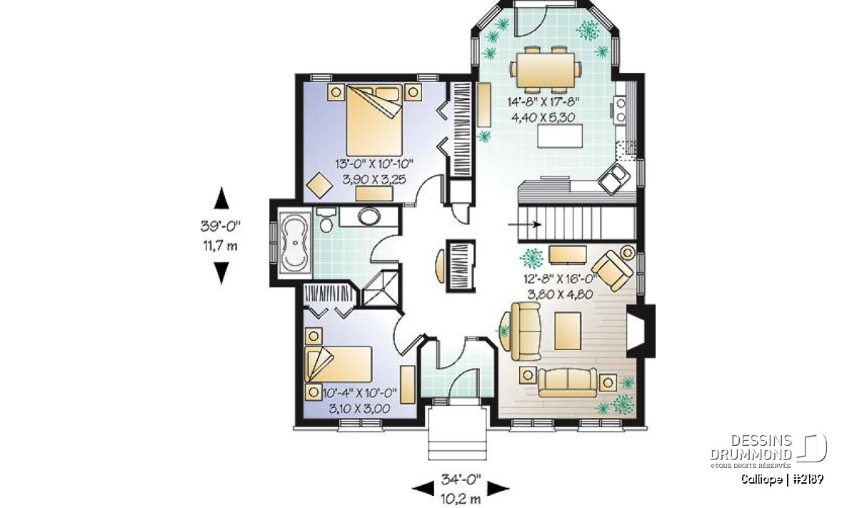 Plan de maison économique, 2 chambres, séjour remarquable avec foyer