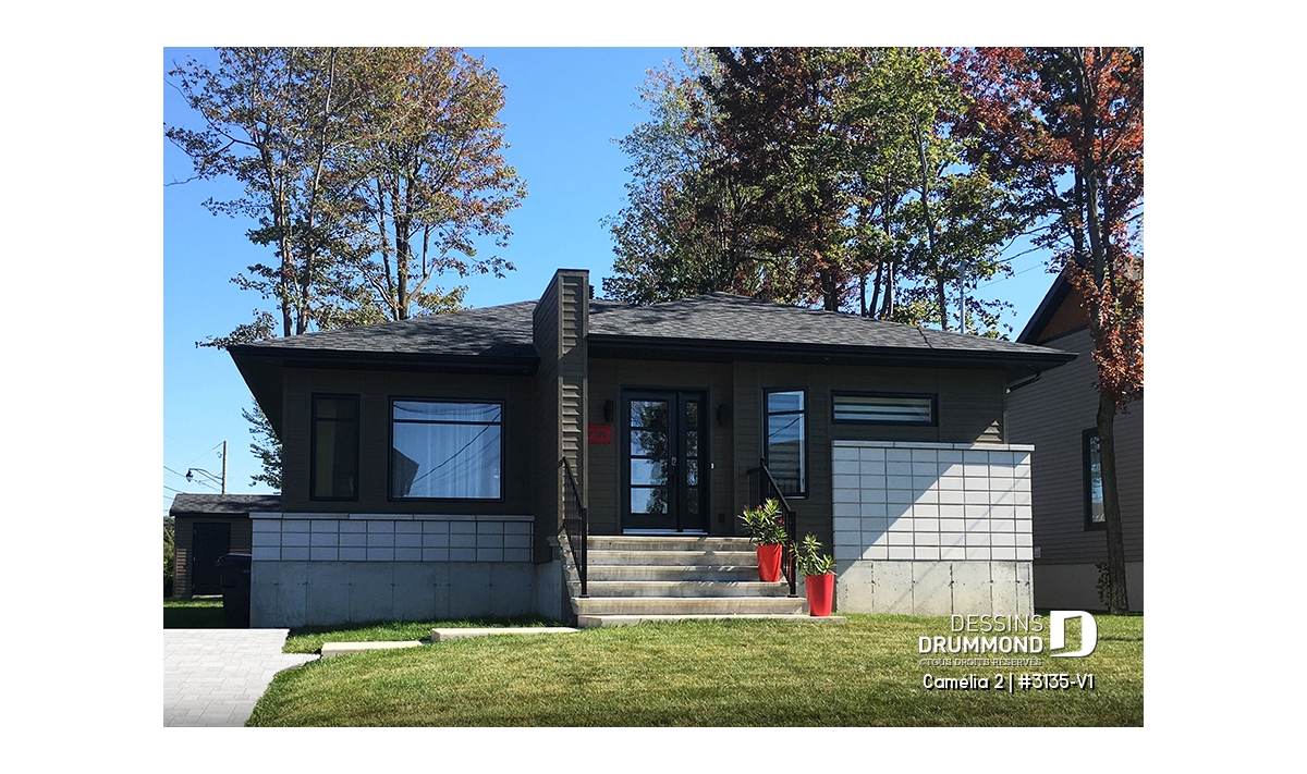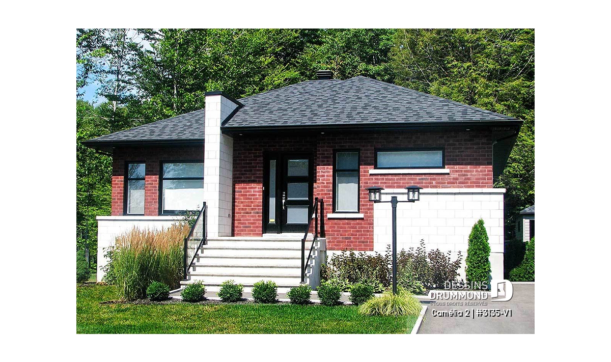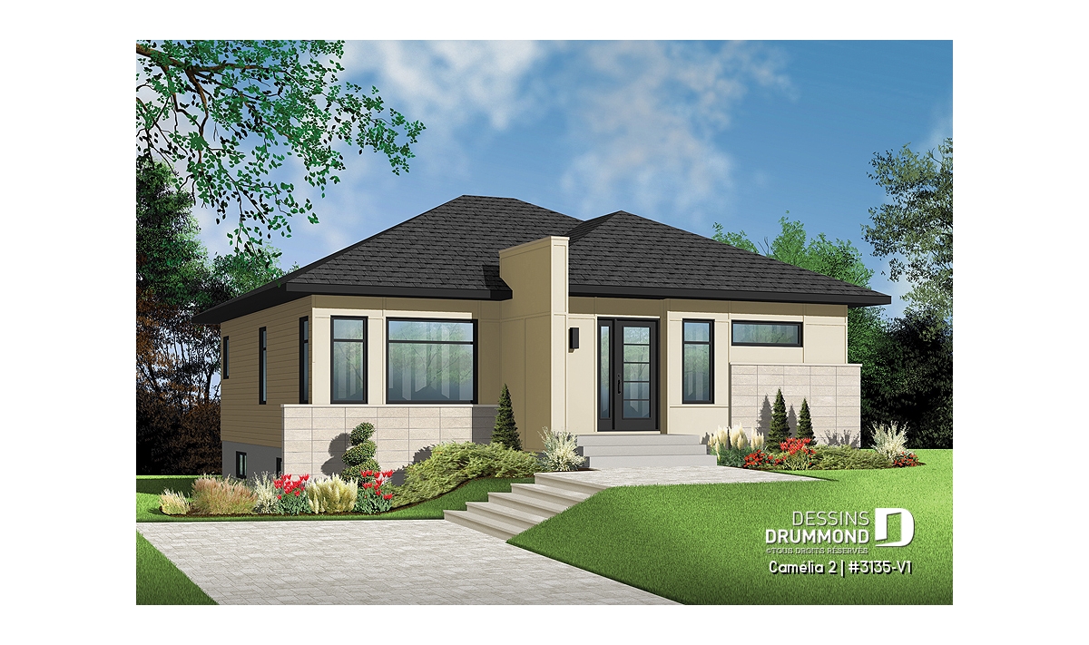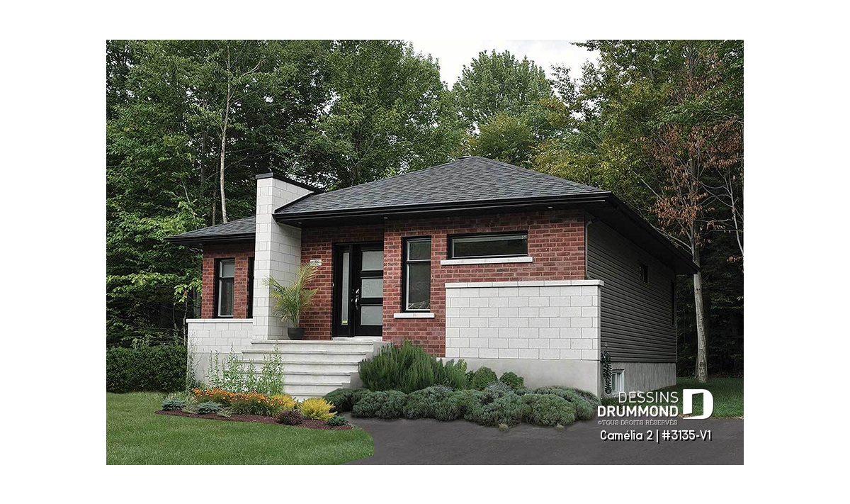 Ce plan est la preuve qu'une maison plein pied n'a pas besoin d'être plate! Le style architectural de l'entrée et les fenêtres modernes donnent un style originale à cette belle maison.