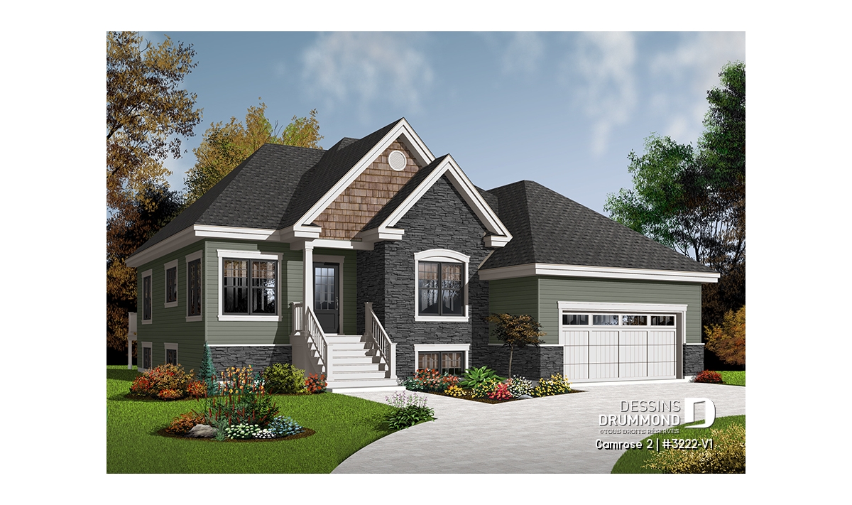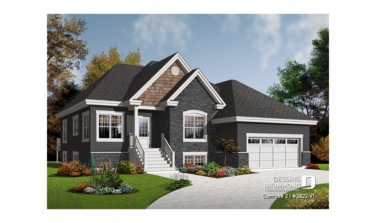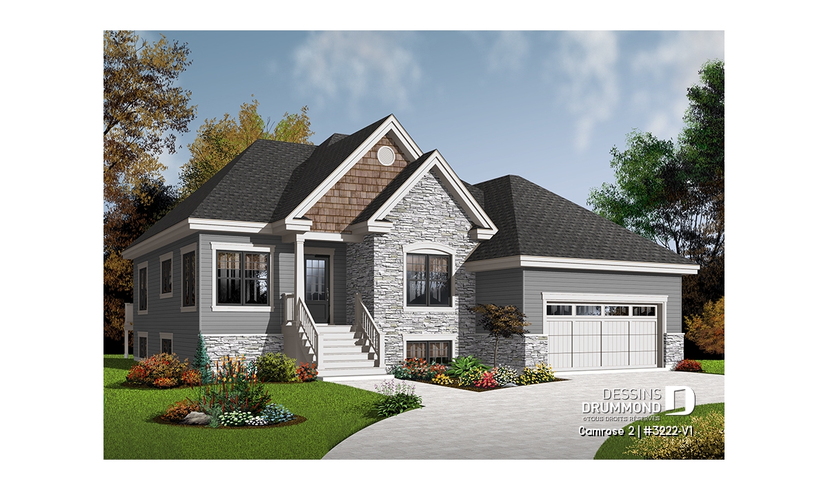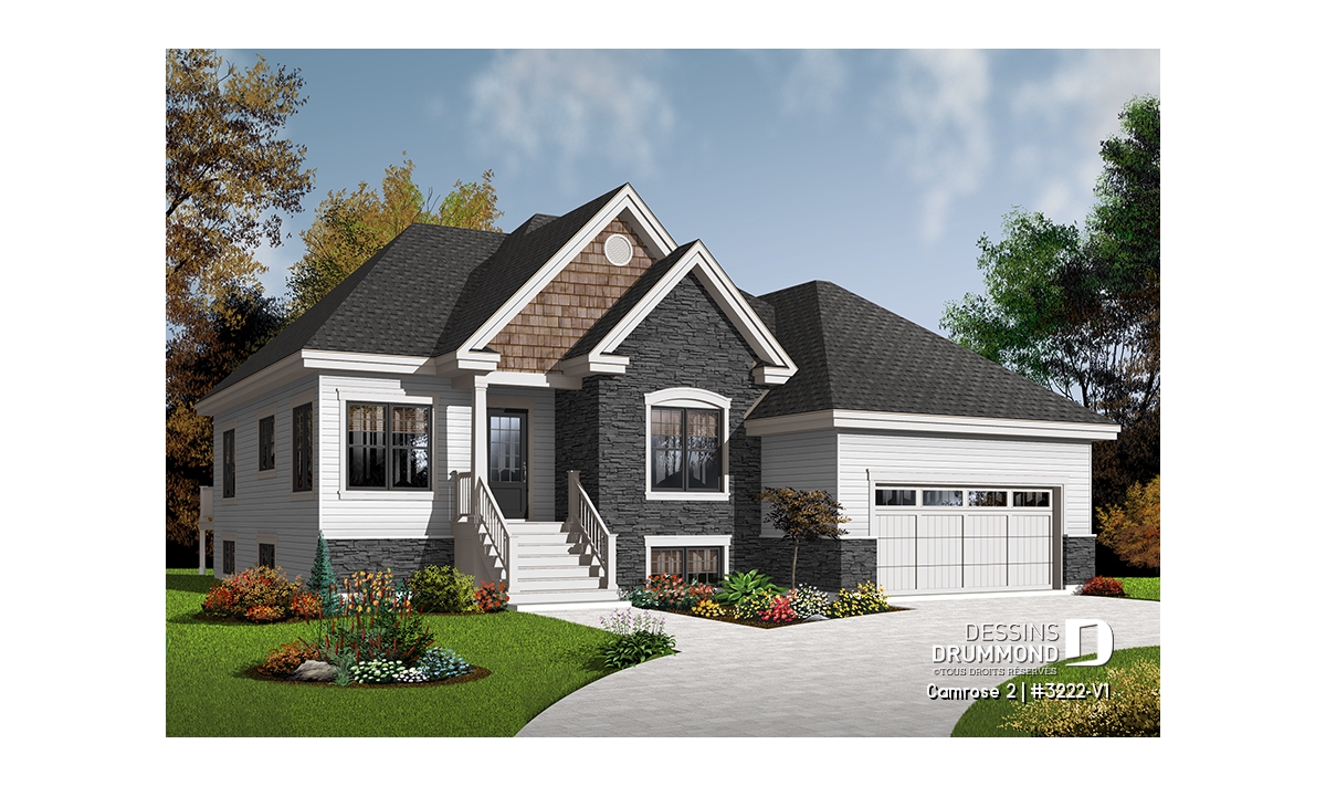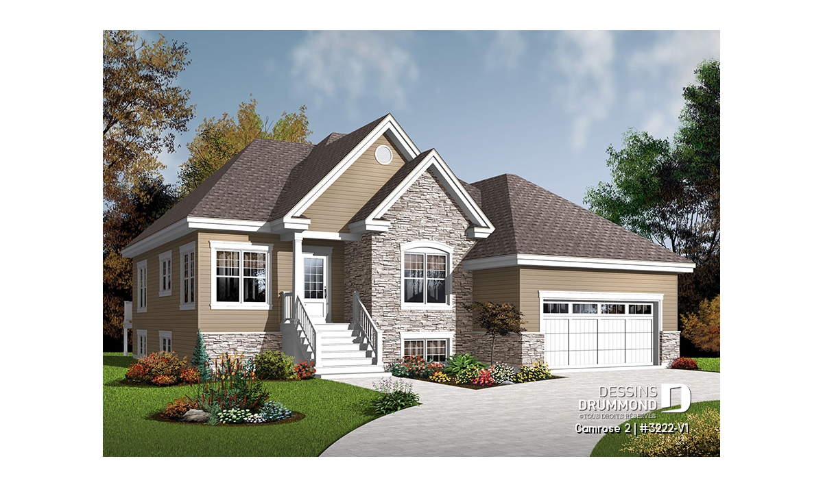 Après que le plan original 3222 ait obtenu un vif succès sur le marché québécois, les concepteurs ont finalement constaté que ce modèle était fréquemment modifié dans les Agences de Dessins Drummond afin de convertir le garage simple en garage double. De plus, la plupart de ces plans avaient vu leur rez-de-chaussée passer d’un plafond de 8 pi à un plafond de 9 pi de hauteur. Voici donc, enfin dirons certains, ce modèle 3222-V1 avec garage double et plafond à 9 pi au rez-de-chaussée.