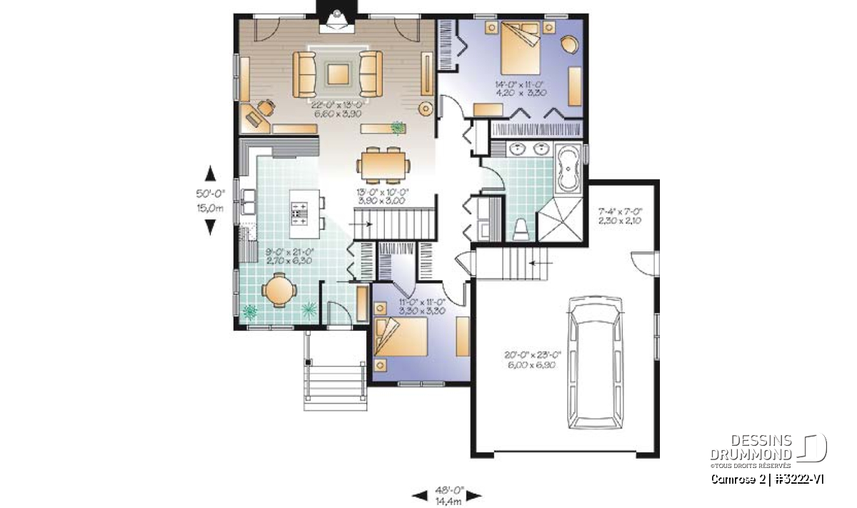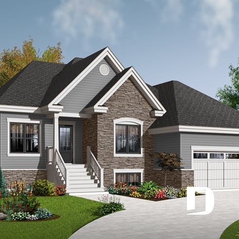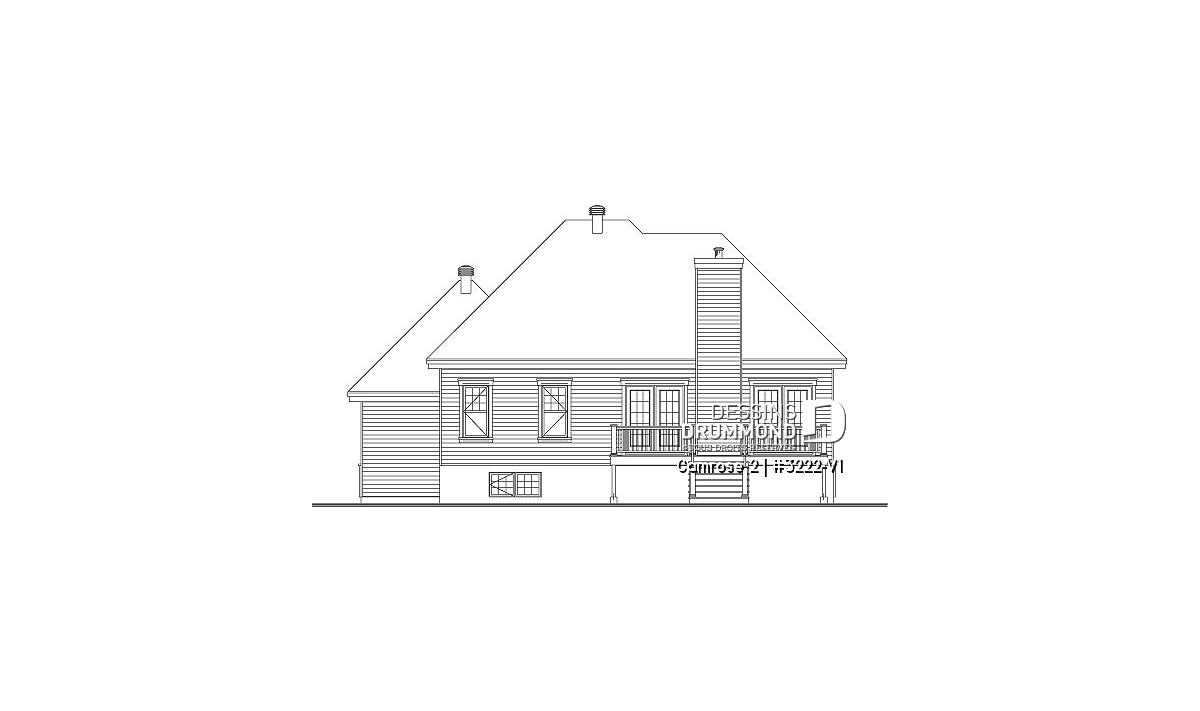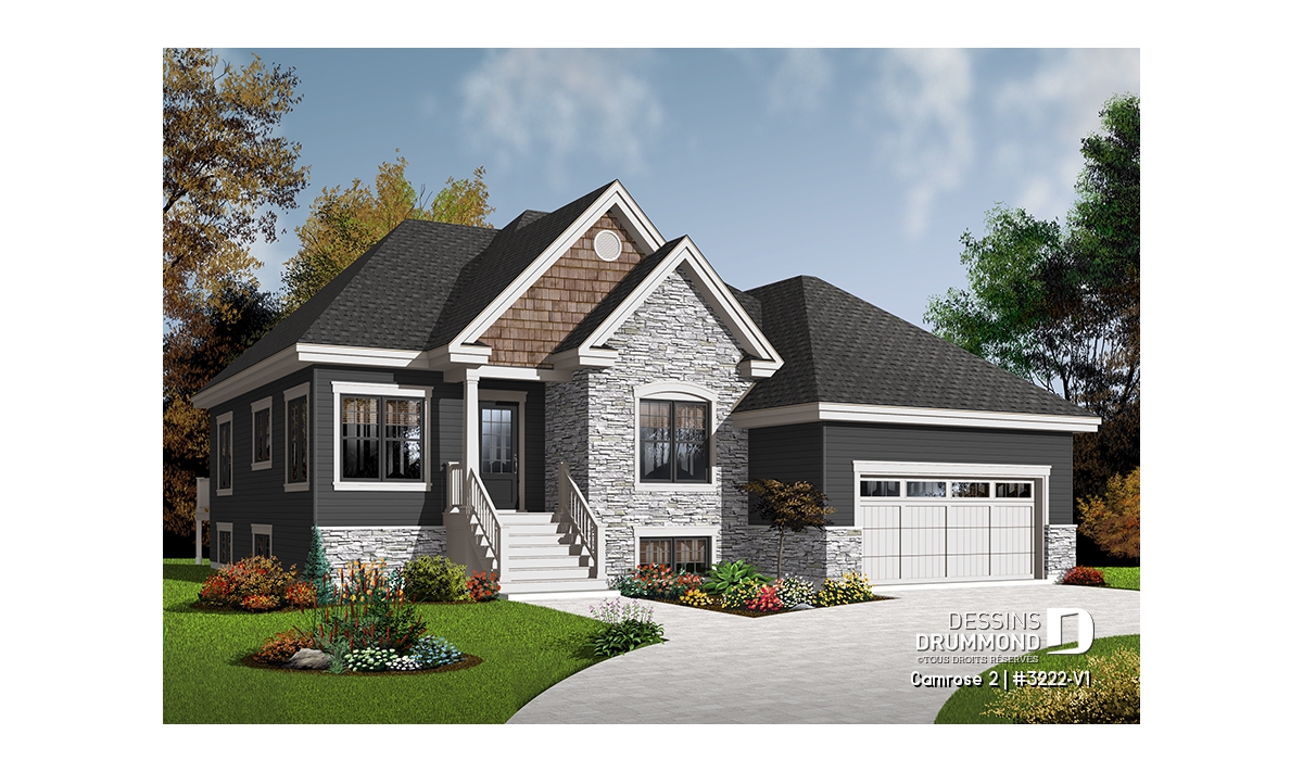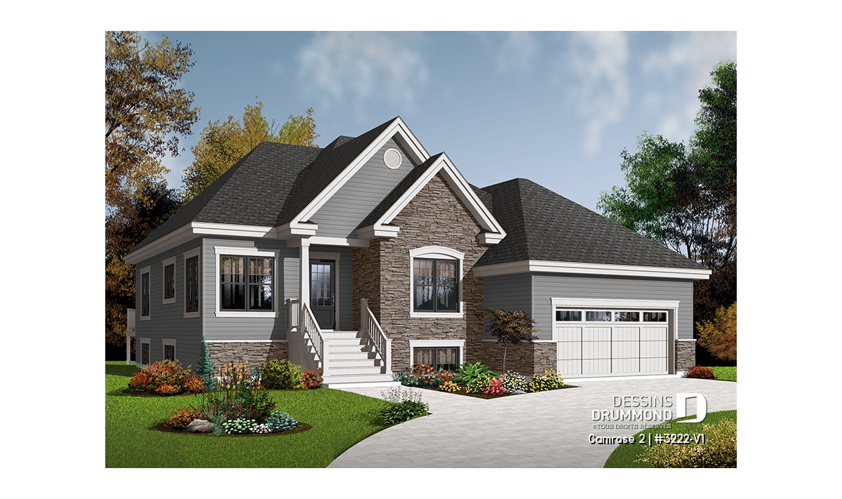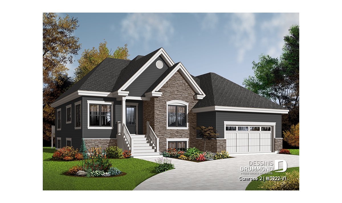 Après que le plan original 3222 ait obtenu un vif succès sur le marché québécois, les concepteurs ont finalement constaté que ce modèle était fréquemment modifié dans les Agences de Dessins Drummond afin de convertir le garage simple en garage double. De plus, la plupart de ces plans avaient vu leur rez-de-chaussée passer d’un plafond de 8 pi à un plafond de 9 pi de hauteur. Voici donc, enfin dirons certains, ce modèle 3222-V1 avec garage double et plafond à 9 pi au rez-de-chaussée.