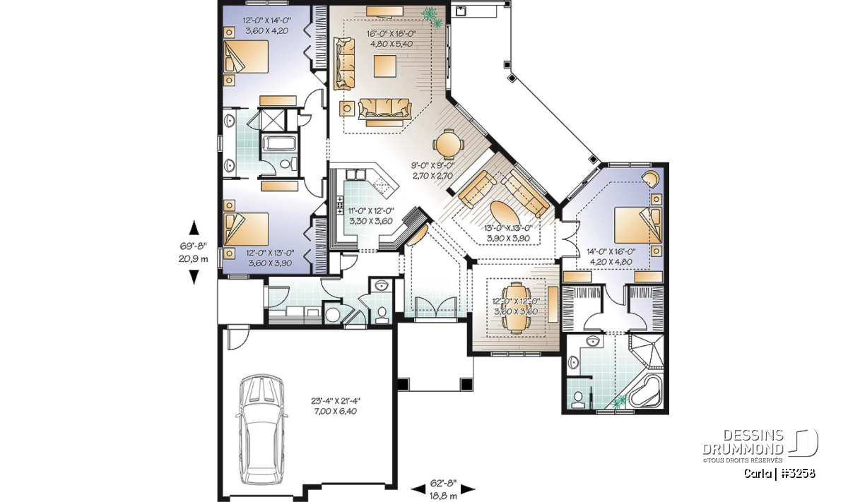 Plafond à 11'-4" à l'entrée, la salle à manger, la salle de séjour, la suite chambre des maîtres, la cuisine, la dînette et la salle familiale. Plafond à 10'-0" aux chambres secondaires et aux utilités. Plafond cathédrale à la salle de bain de la chambre des maîtres. Entrée principale bien abritée tout comme le patio arrière qui l'est en totalité tout en étant accessible de la chambre des maîtres et de la salle familiale. Belle organisation intérieure avec angles permettant une minimisation de corridor et une maximisation de l'espace viable. Grand espace dînette pouvant fort bien être converti en salle à manger et permettant à celle-ci d'être aménagée en bureau ou en salle de jeux.