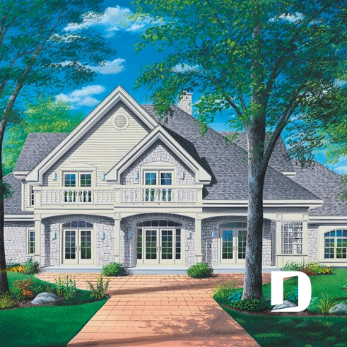 Plan de maison luxueuse avec 5 chambres, suite des maîtres au r-d-c, plafond cathédrale, garage triple