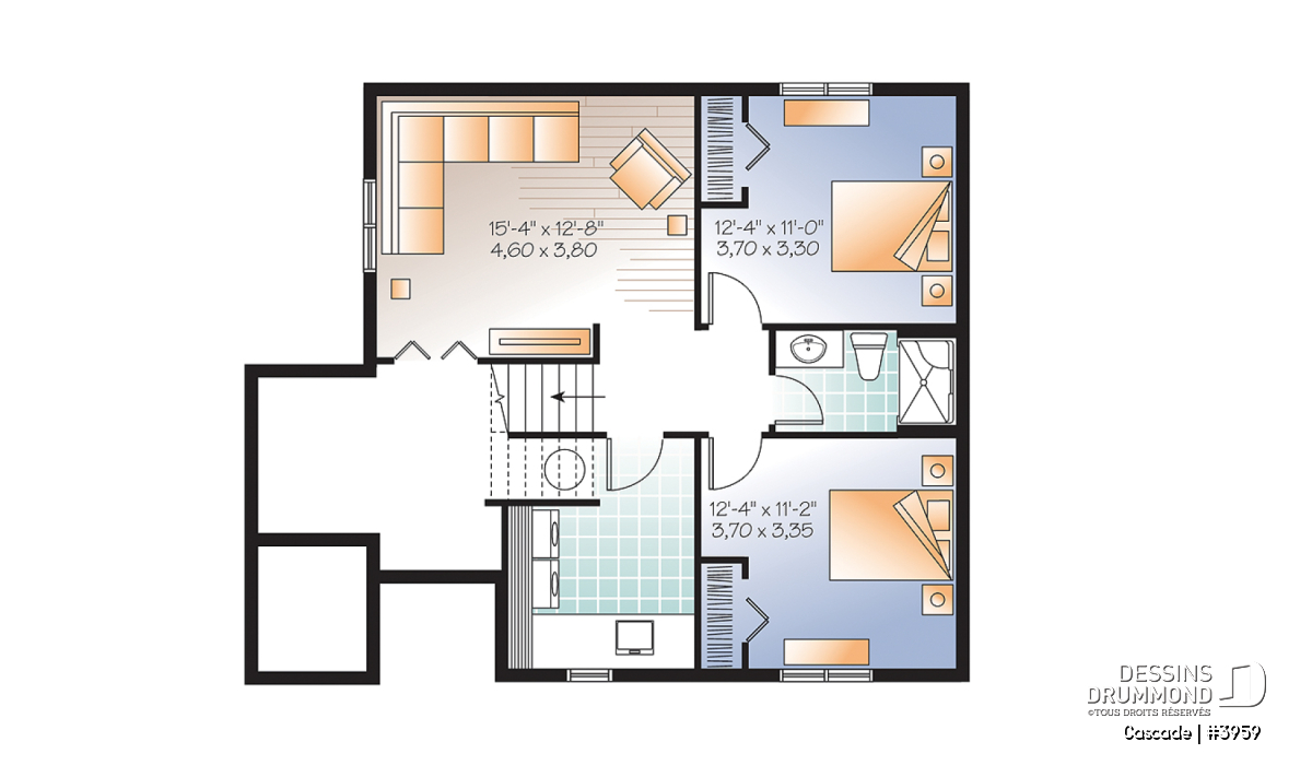 Sous-sol pensé pour adolescents avec chambres secondaires de bon format, salle de jeux ou 4è chambre et salle de douche.