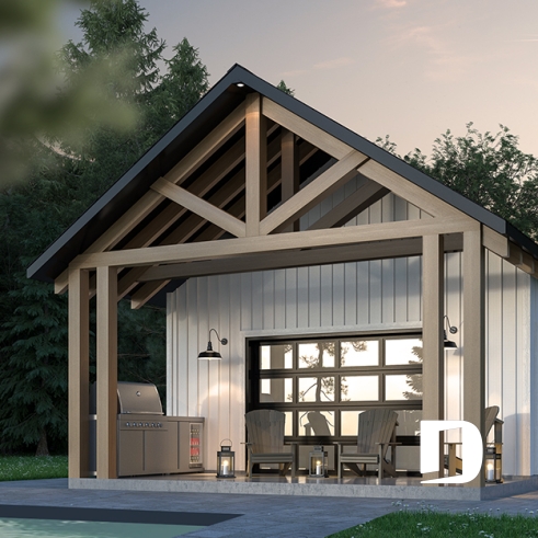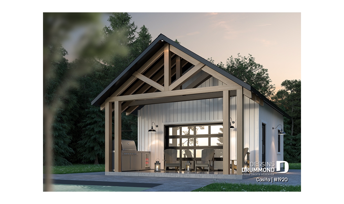 Enfin, la vaste terrasse abritée offre tout le potentiel nécessaire pour accueillir une cuisine extérieure, une salle à manger ou un espace détente, faisant du plan CASITA (#1920) un cabana aussi fonctionnel que chaleureux, pensé pour profiter pleinement de la belle saison.
