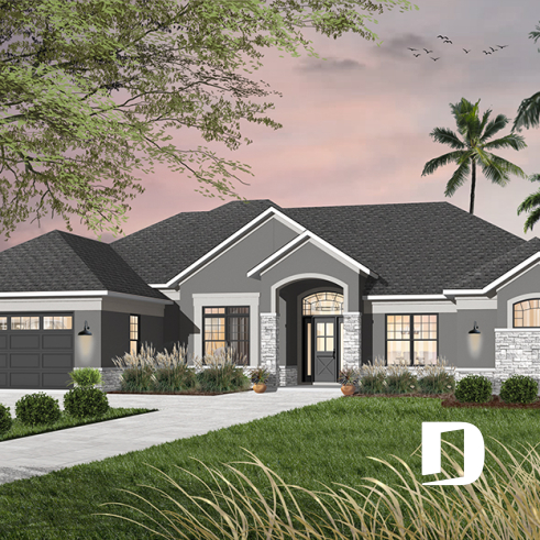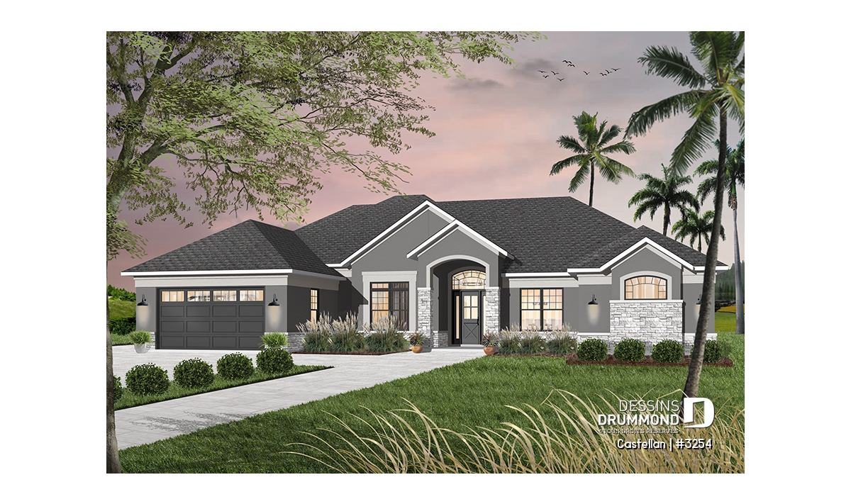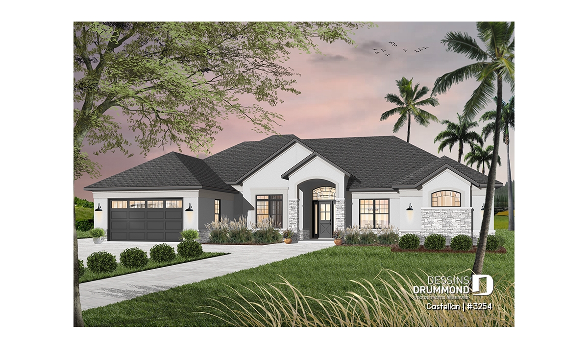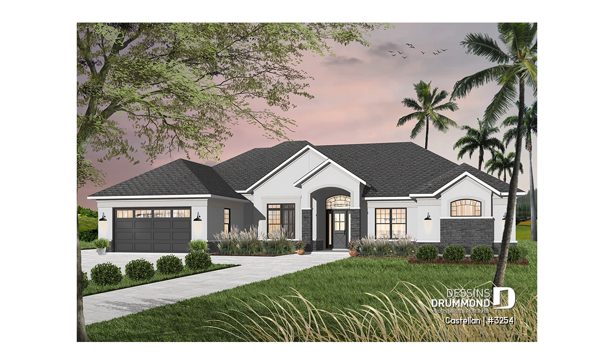 Vue avant - MODÈLE DE BASE - Plan de maison plain-pied 4 chambres, bureau à domicile, 3.5 salles de bain, garage double - Castellan