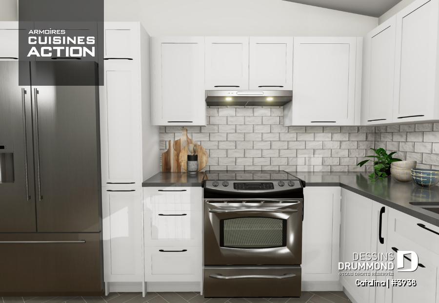 Les armoires incluses aux estimations sont de qualité standard. Les dessus de comptoir sont en stratifié standard, sauf pour les maisons plus haut de gamme (à plus de 500,000$ approx.), qui prévoient des comptoirs en surface solide de type quartz. Les dosserets de comptoir sont prévus en céramique moyenne de gamme. La plomberie de la cuisine ainsi que les luminaires fixes sont inclus dans les estimations.
