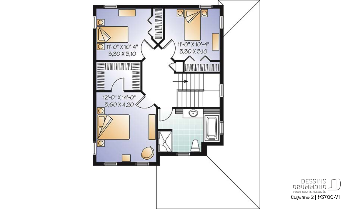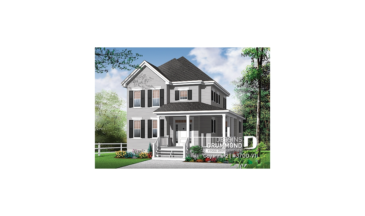 À l’intérieur, ce plan suggère un aménagement à la fois pratique et fort similaire au plan dont il origine avec, au rez-de-chaussée, une entrée dégagée, un foyer mitoyen à la salle de séjour et la salle à manger, une cuisine agrémentée d’un îlot central alors qu’à l’étage, on retrouve trois belles chambres avec garde-robes de bonnes dimensions et plus particulièrement celle de la chambre des maîtres ou walk-in de format suffisamment attrayant pour que certains futurs propriétaires envisagent de le convertir en deuxième salle de bain. À noter ici la suggestion d’une douche de plus grand format que celle proposée en coin sur le 3700 d’origine et afin de rencontrer les attentes de bien de propriétaires.
