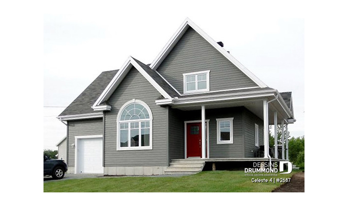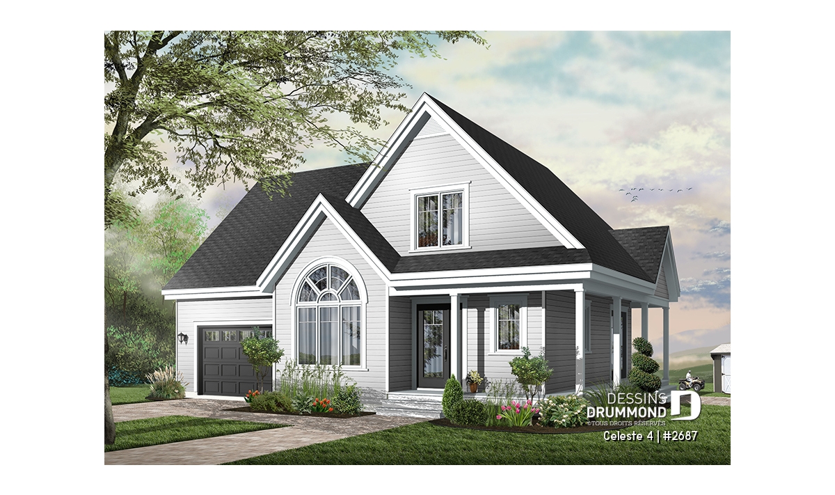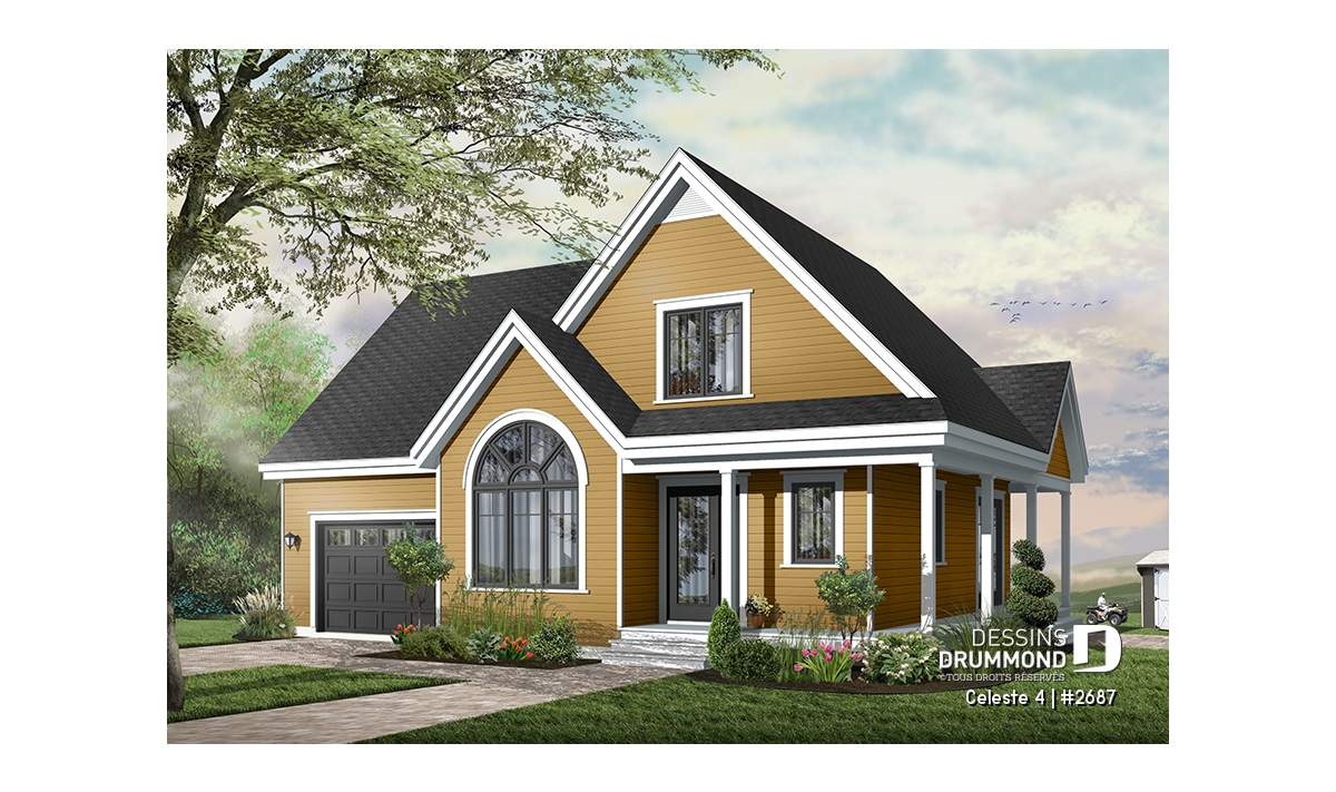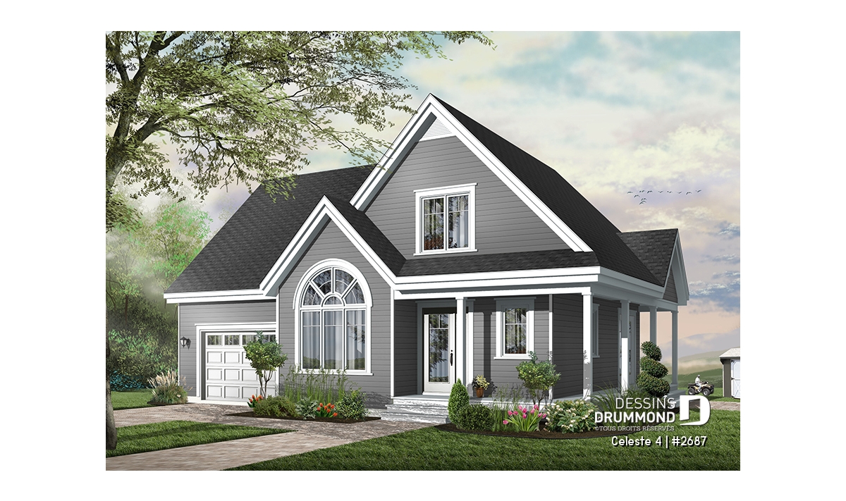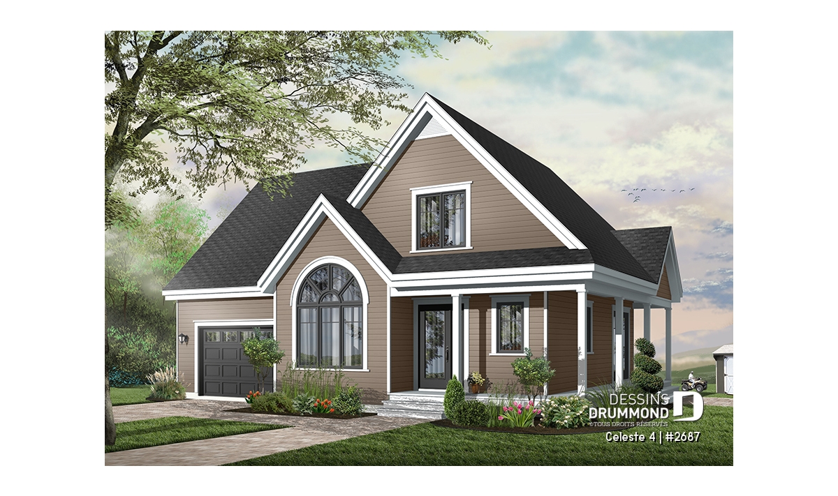 Vue avant - MODÈLE DE BASE - Plan de maison de champêtre, 3 grandes chambres, garage, salle à manger tout en lumière, maison abordable - Celeste 4