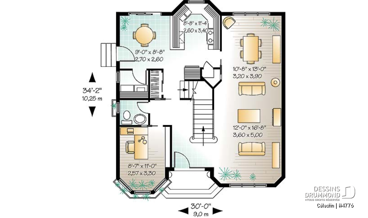 Doté de volumes bien balancés et d’une fenestration plus que remarquable en façade principale, ce cottage plan no. 4776 de Dessins Drummond, aussi appelé Célestin, nous charme dès qu’il apparaît à nos yeux. La couleur relevée, suggérée par l’enduit acrylique aux murs, n’est assurément pas étrangère à cet effet immédiat. Entrons donc voir si l’intérieur se veut aussi accrocheur.
