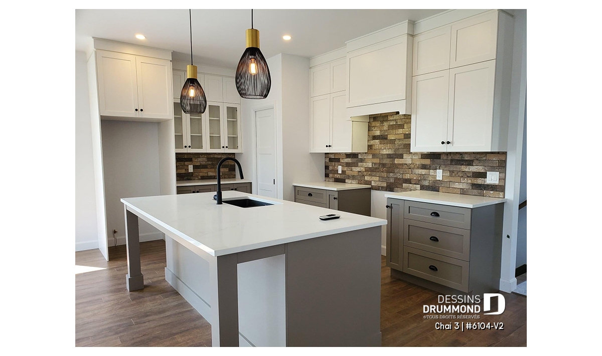 Cuisine avec grand îlot et garde manger de type walk-in.