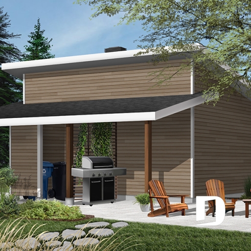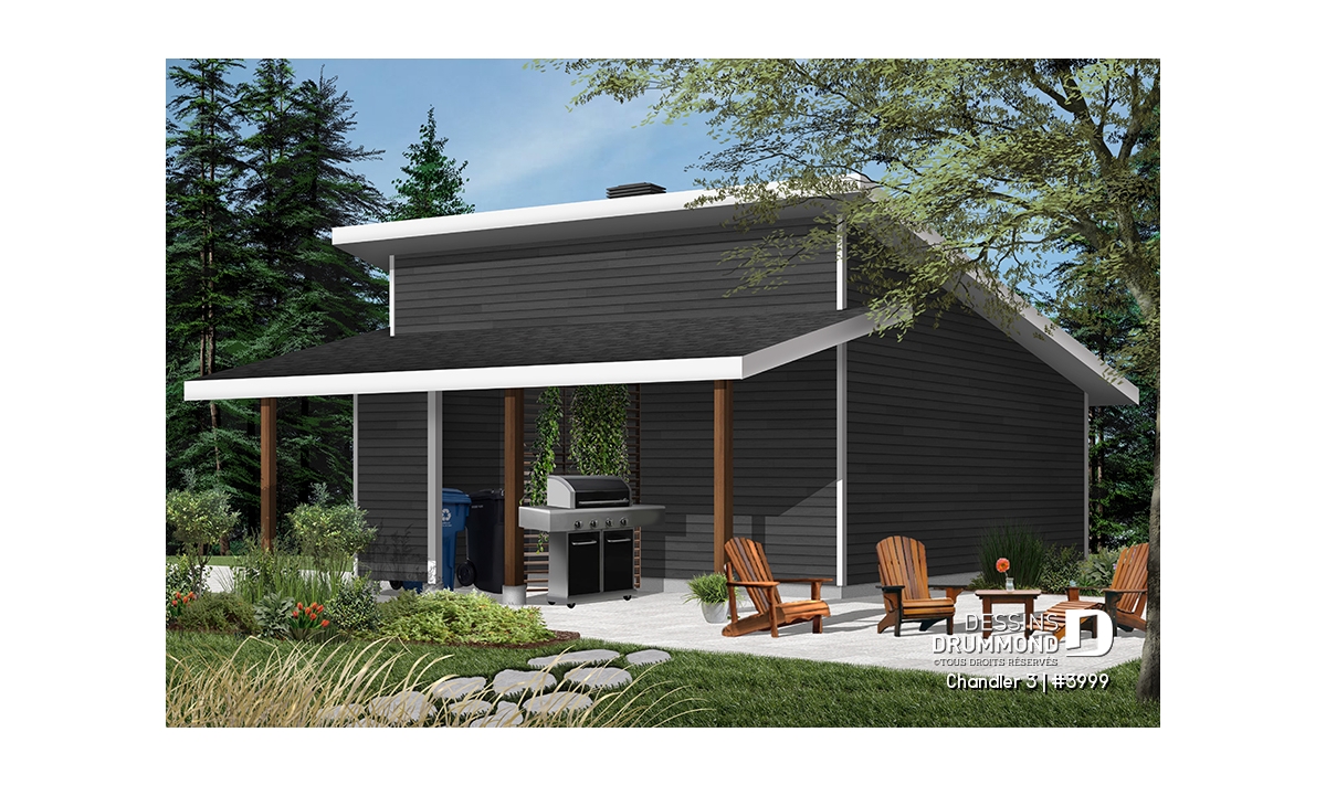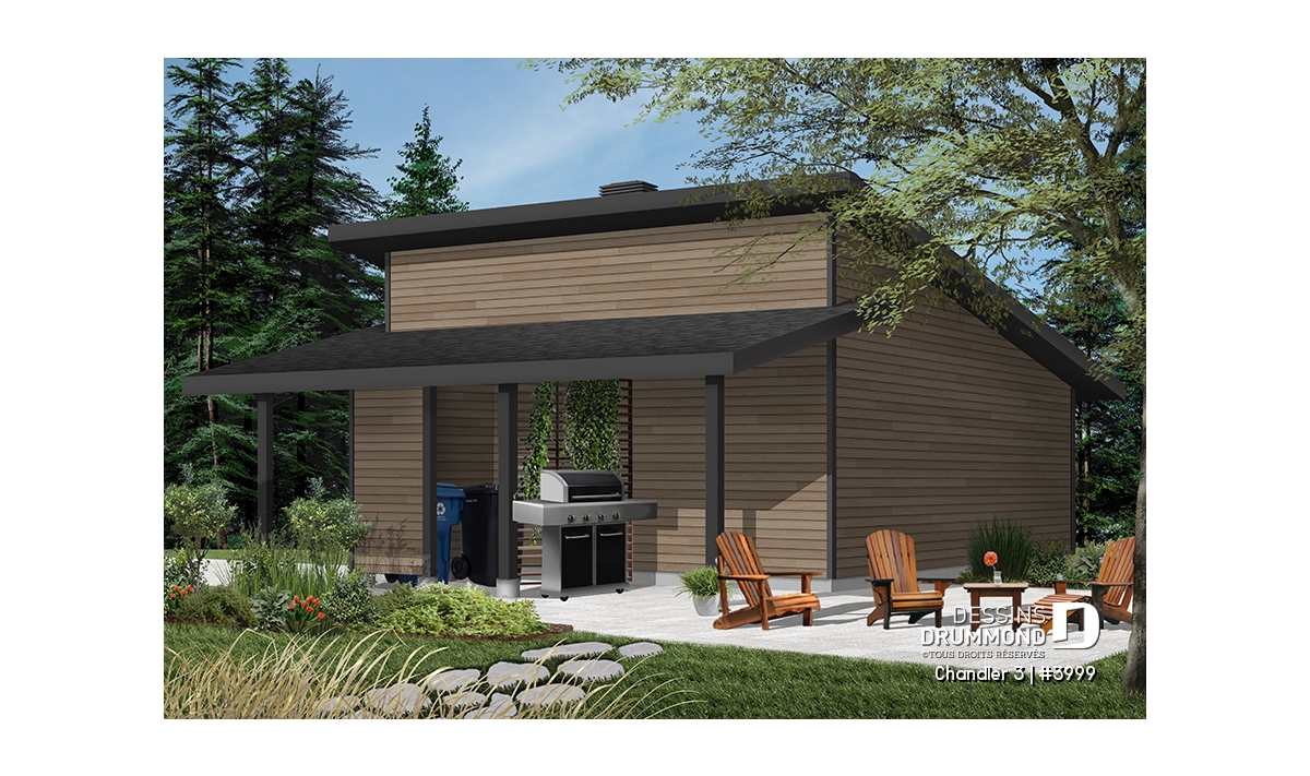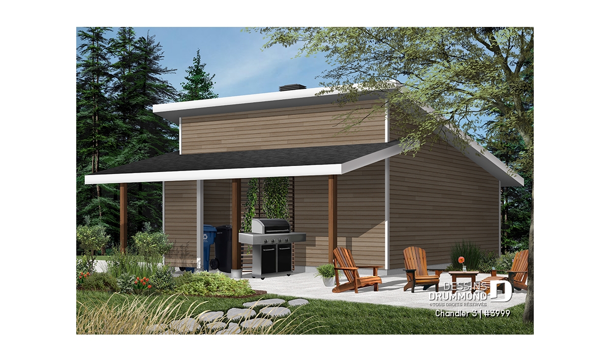 Plan de garage double, de style moderne, avec secteur abritée pour BBQ et rangement
