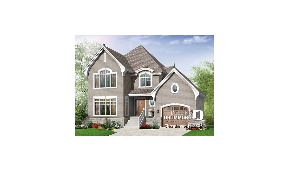 Vue avant - MODÈLE DE BASE - Plan maison champêtre, 3 chambres, garage, salon en contrebas, salle lavage à l'étage - Chandonnet
