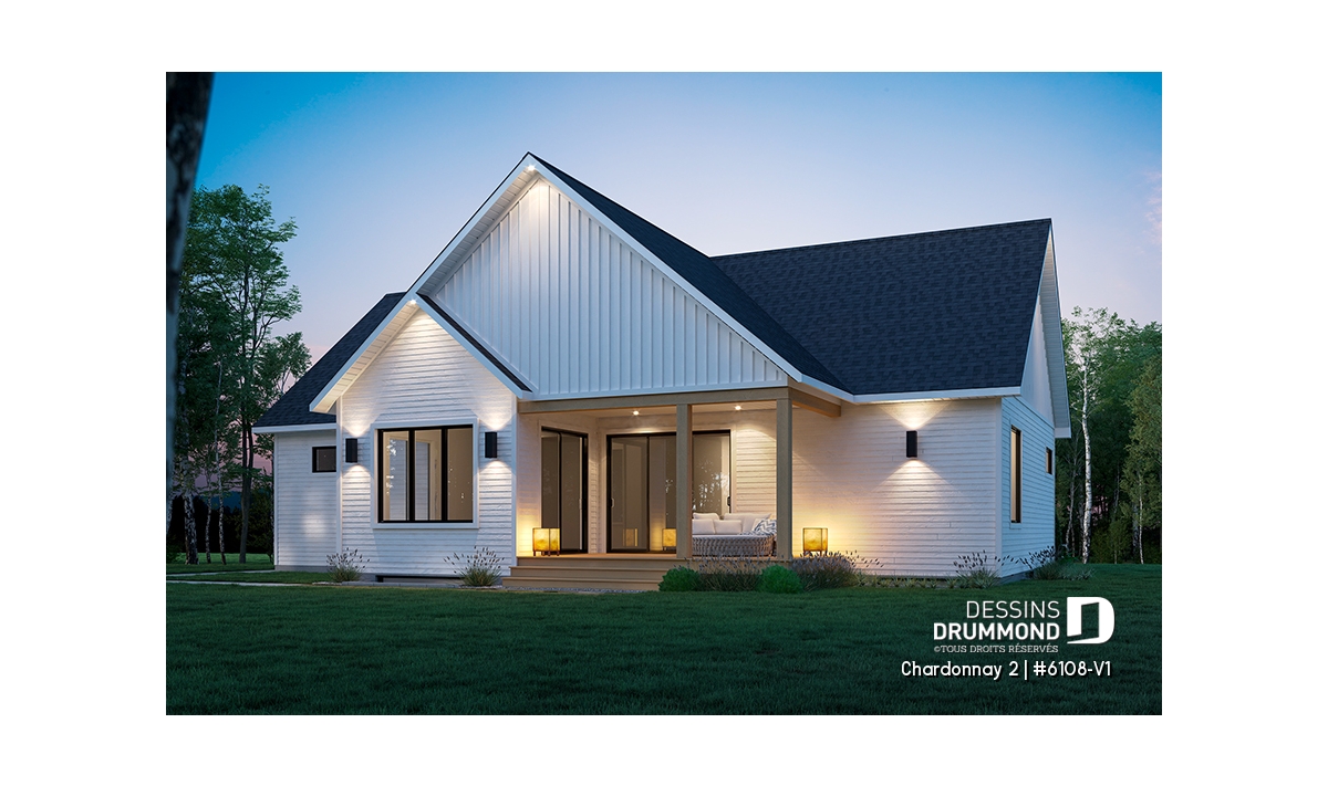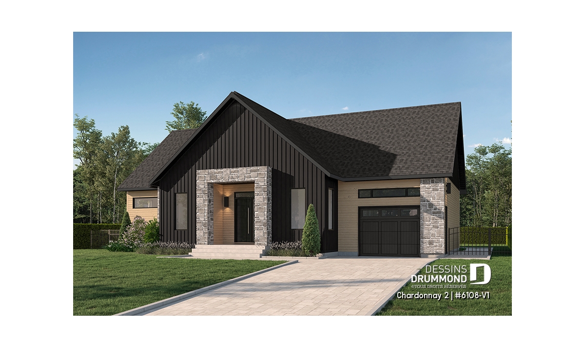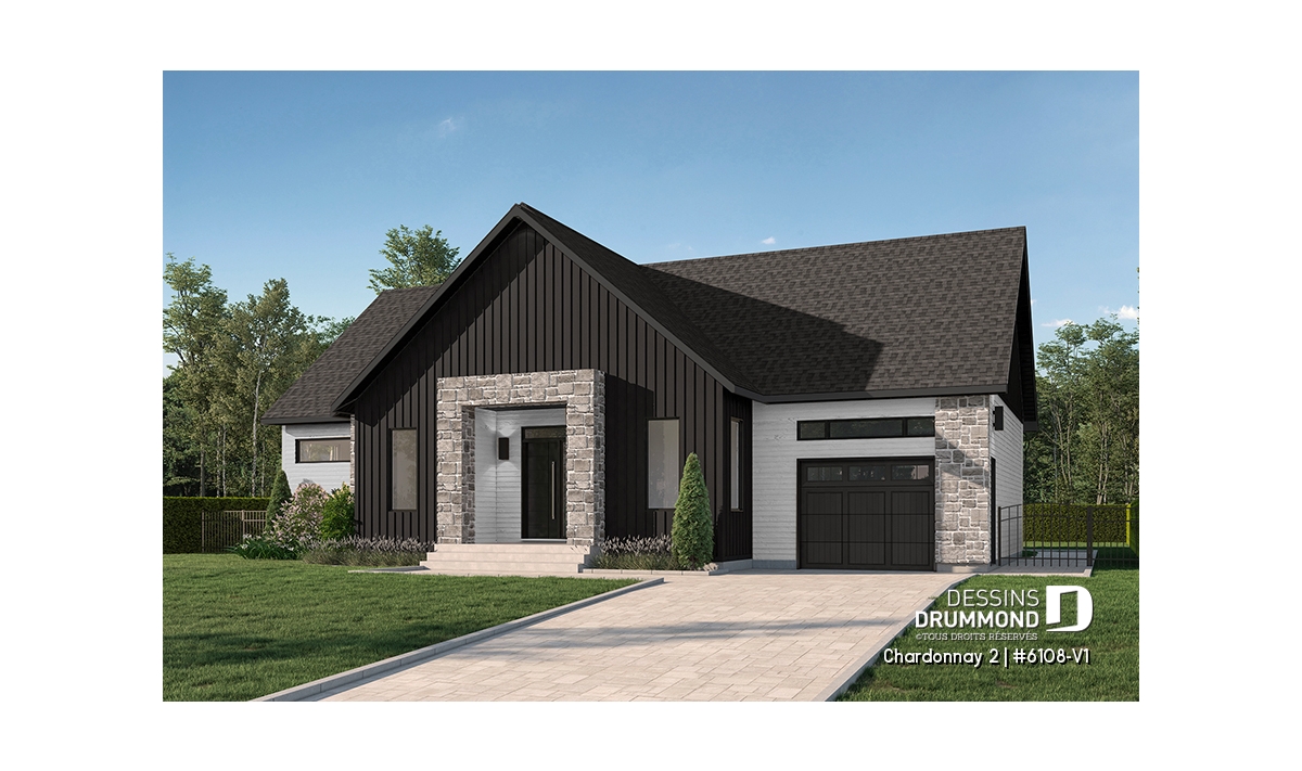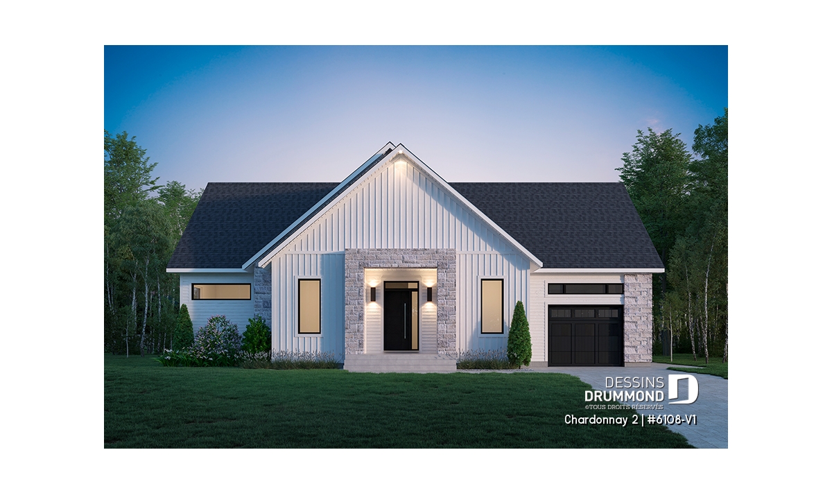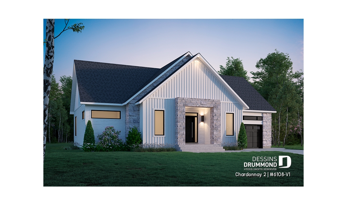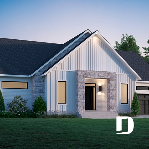 Le plan de maison Chardonnay 2 (#6108-V1) propose 1487 pi.ca. aménagés sur un seul plancher. Ce plan de type plain-pied avec garage de style Moderne Scandinave propose un look épuré tout en maximisant les espaces intérieurs et extérieurs, tel le balcon avant et la terrasse arrière qui sont tous les deux abrités.