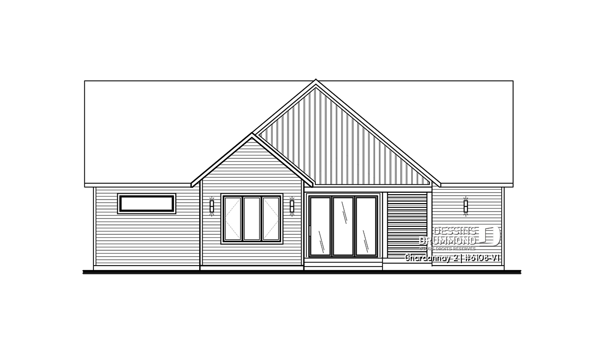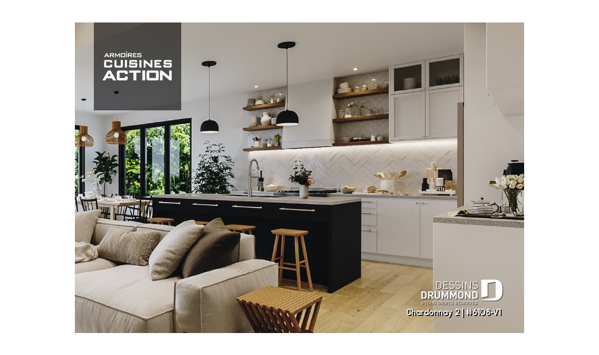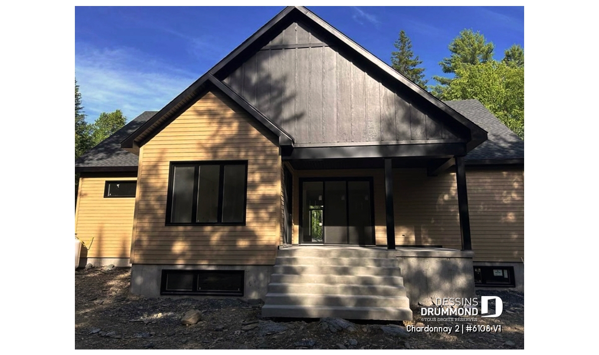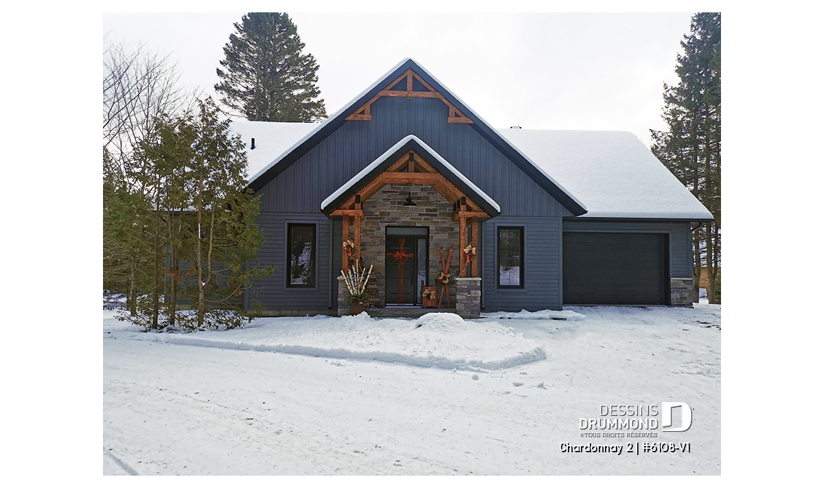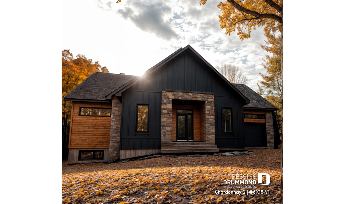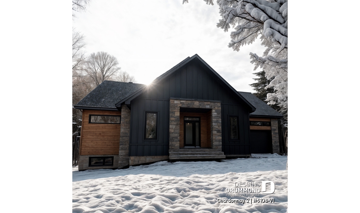 Le plan de maison Chardonnay 2 (#6108-V1) propose 1487 pi.ca. aménagés sur un seul plancher. Ce plan de type plain-pied avec garage de style Moderne Scandinave propose un look épuré tout en maximisant les espaces intérieurs et extérieurs, tel le balcon avant et la terrasse arrière qui sont tous les deux abrités.